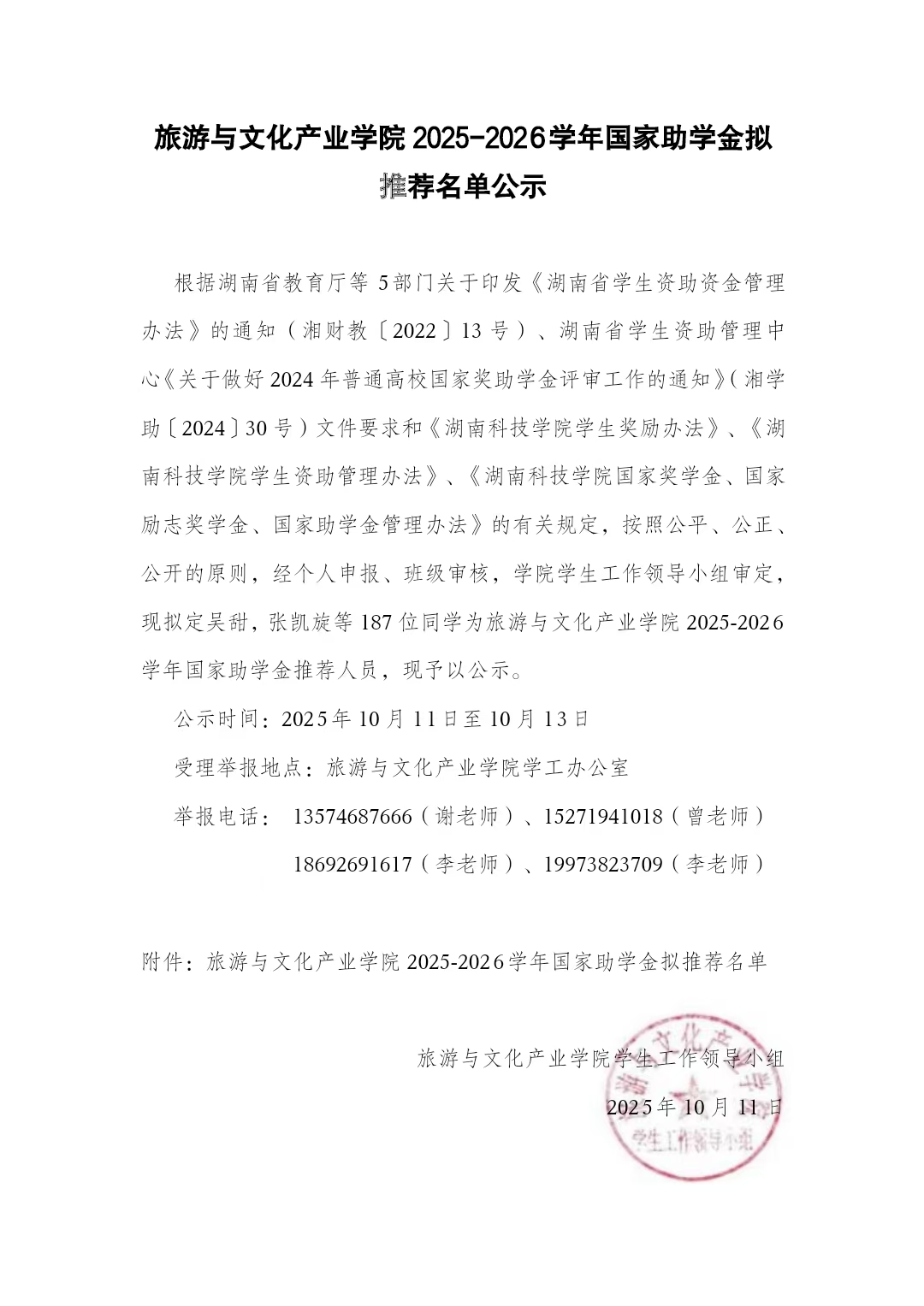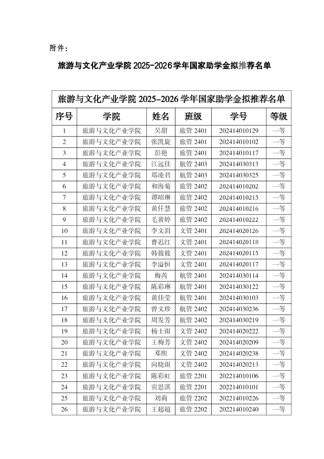 旅游与文化产业学院2025-2026学年国家助学金拟推荐名单公示