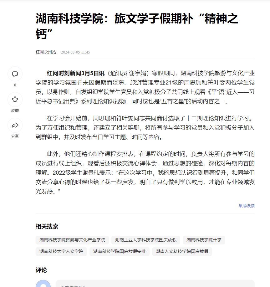 红网时刻新闻3月5日讯(通讯员 谢宇娟)寒假期间,bat365中文官方网站旅游与文化产业学院的学习氛围并未因假期而淡薄。旅游管理专业21级的周思珈和符叶雯两位学生党员,以身作则,自发组织学院学生党员和入党积极分子共同线上观看《平“语”近人——习近平总书记用典》系列理论知识视频,同时这也是“五育之星”的活动内容之一。