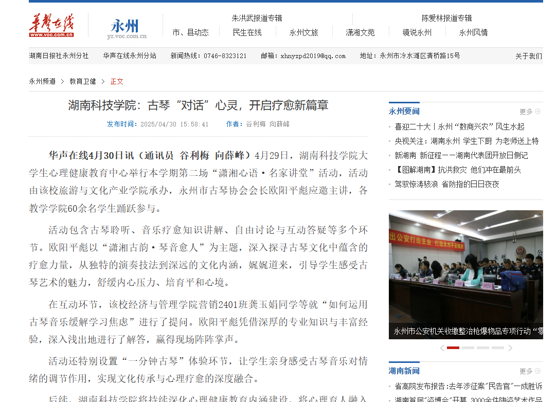 华声在线4月30日讯(通讯员 谷利梅 向薛峰)4月29日,bat365中文官方网站大学生心理健康教育中心举行本学期第二场“潇湘心语·名家讲堂”活动,活动由该校旅游与文化产业学院承办,永州市古琴协会会长欧阳平彪应邀主讲,各教学学院60余名学生踊跃参与。