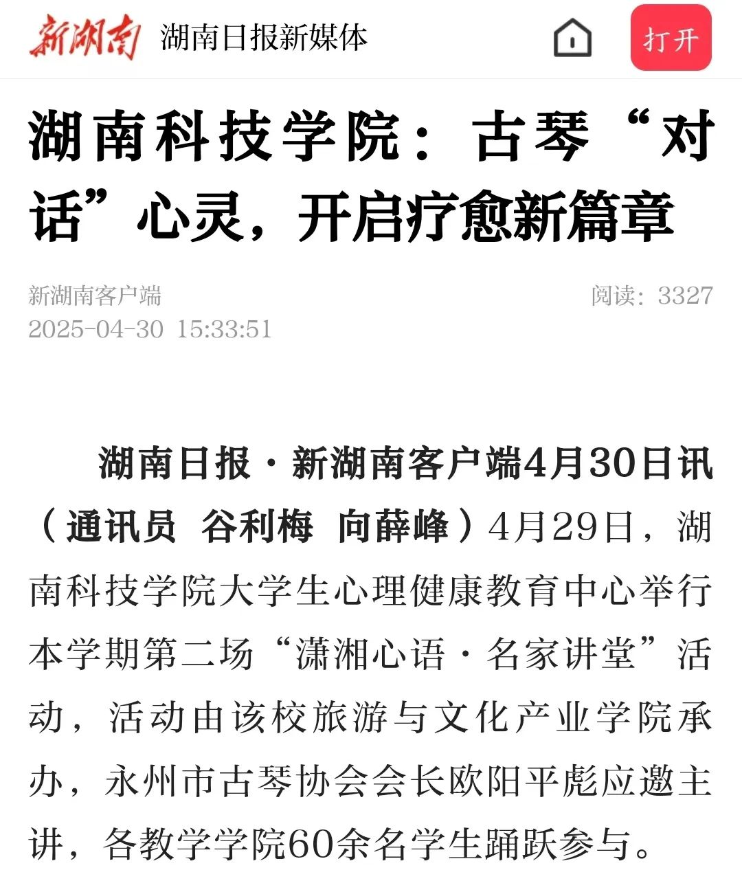(湖南日报·新湖南客户端4月30日讯)4月29日,bat365中文官方网站大学生心理健康教育中心举行本学期第二场“潇湘心语·名家讲堂”活动,活动由该校旅游与文化产业学院承办,永州市古琴协会会长欧阳平彪应邀主讲,各教学学院60余名学生踊跃参与。