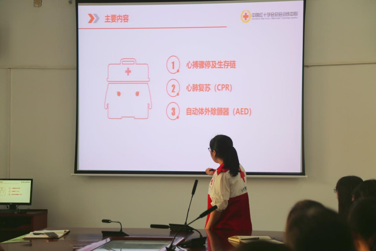 本次培训主要涵盖了心肺复苏和海姆立克应急救护技能两个方面。培训会上,针对学生与老师在生活中可能遇到的突发状况,主讲人对“心肺复苏”、“海姆立克急救法”的步骤以及操作进行了详细的介绍,其中包括黄金两分钟抢救、自动体外除颤器(AED)等救护知识。主讲人详细介绍了海姆立克急救法,并且邀请学生一起进行演示。培训的最后,为将理论知识转变成为实践,培训师资带领师生们开展急救演习,并对“口腔异物处理”、按压位置等急救步骤进行指导。活动氛围融洽,师生们积极提问交流,参与并体验心肺复苏的各项基本操作步骤。