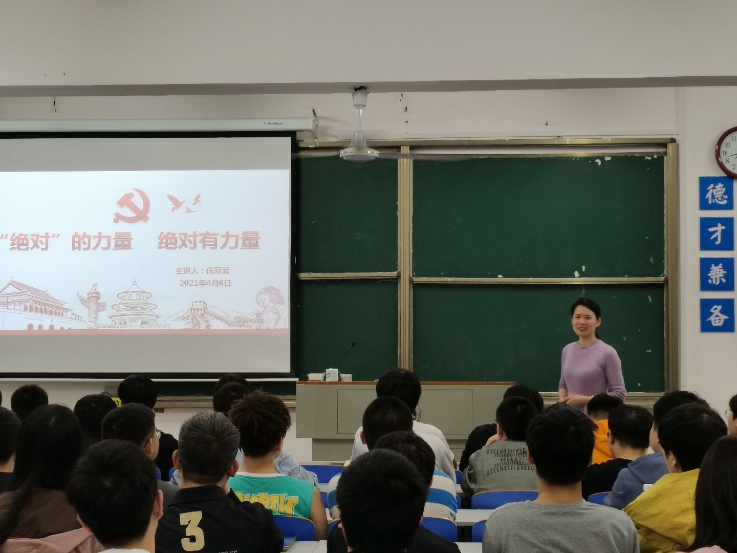 教师党员伍双武老师在信计1902班,以“绝对的力量,绝对有力量”为题,讲述了红军第五次反围剿失败后,红三十四师师长陈树湘断肠明志的故事。陈树湘的故事让同学们对中国共产党的历史和其精神气节有了深刻的理解,更激起了同学们入党的承诺和决心,感悟到一代共产党人的坚定信念与赤子情怀。