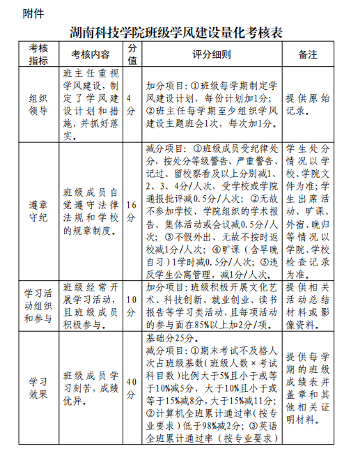第三条班级的学风建设量化考核主要包括组织领导、遵章守纪、学习活动组织和参与、学习效果、学习竞赛获奖、教师评价等六个指标,考核指标体系的具体内容、标准见附件《bat365中文官方网站班级学风建设量化考核表》。