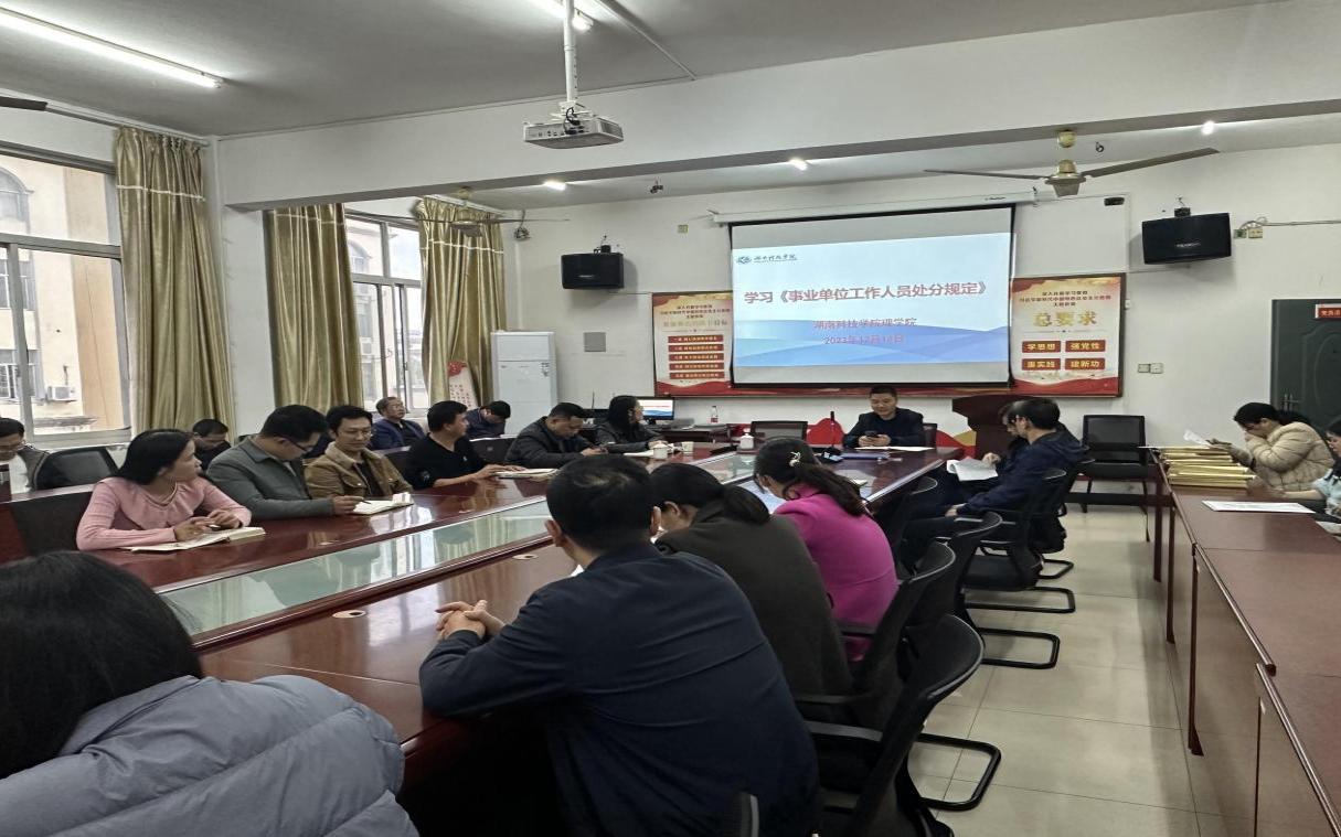 本网讯(通讯员:李雨萱)为严明工作责任和纪律,强化作风建设,保证事业单位及其工作人员依法履职,12月14日下午,理学院组织全体教师在明理楼308集中学习《事业单位工作人员处分规定》,会议由理学院院长李小武主持。
