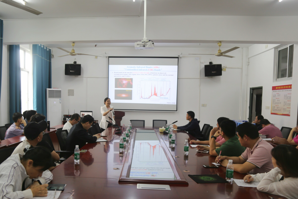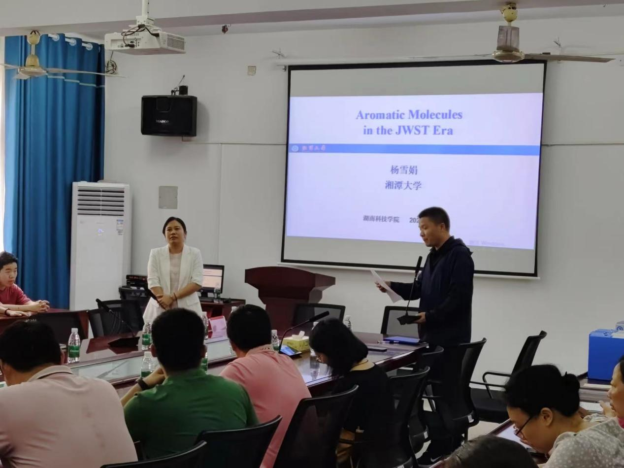本网讯(通讯员:杨怡)为了让理学院师生对天文知识有更深入的了解,拓宽知识面,理学院于5月30日下午在明理楼313举行了以“JWST时代的星际芳香分子研究”为主题的学术讲座,讲座由湘潭大学物理与光电工程学院院长杨雪娟博士主讲,理学院院长李小武主持,理学院部分师生参加。