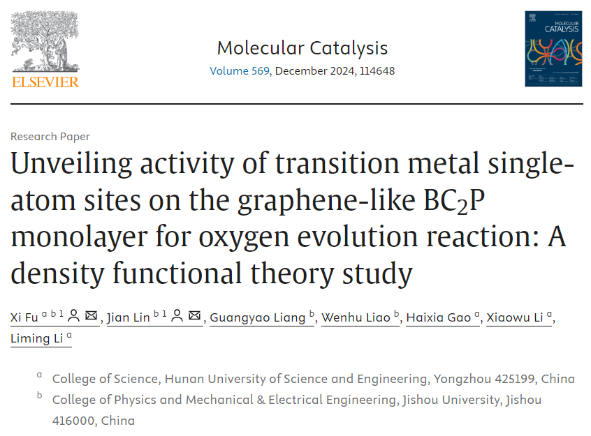 (本网讯 高海峡)近日,理学院付喜教授研究组连续完成两个研究工作成果,分别以“Density Functional Theory Study of Phosphorus Silicide Monolayers as Anodes for Lithium-Ion Batteries and Electrocatalysts for CO2 Reduction”和“Unveiling activity of transition metal single-atom sites on the graphene-like BC2P monolayer for oxygen evolution reaction: A density functional theory study”为题发表在ACS Applied Nano Materials(IF 5.3,中科院二区期刊)和Molecular Catalysis(IF 3.9,中科院大类二区)期刊上。bat365官网为论文的第一完成单位,吉首大学为第二完成单位,付喜教授为第一作者和通讯作者,所指导的吉首大学物理学专业硕士研究生林健为共同第一作者,理学院李小武教授、高海峡副教授为共同参与作者。