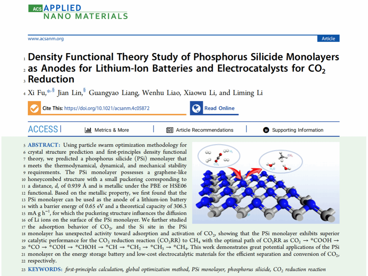 在美国化学学会ACS系列期刊ACS Applied Nano Materials的研究工作中,作者通过CALYPSO软件预测了一个类石墨烯的全新二维薄膜结构:PSi,对该结构的动力学、热力学稳定性进行了分析,确定该二维结构是潜在稳定的材料。基于PSi二维材料的金属性特性,作者研究了该材料在锂离子电池电极材料和电化学CO2还原反应中的应用,结果发现,该材料可作为理想的锂离子电池材料,以及CO2还原反应生成甲烷(CH4)的理想催化剂材料。在该论文发表前不久,恰好有实验研究工作(Adv. Mater. 2024, 36, 2404341)报道了在实验室制备出了PSi金属性二维材料,对其性质研究的相关结果与作者所获得的理论研究结果一致。