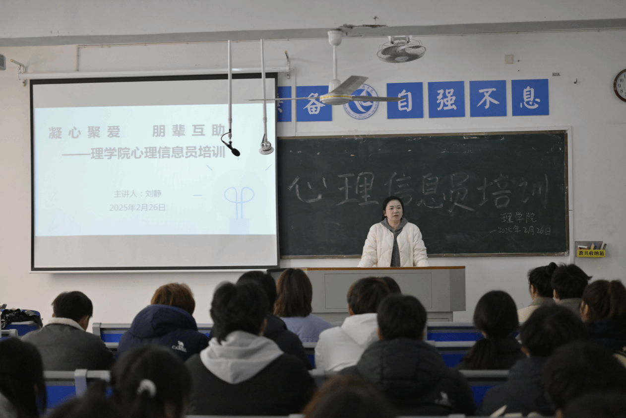 本网讯(通讯员:石庆湘)新学期伊始,为进一步加强心理健康工作队伍建设,提高学院心理信息员工作能力,理学院于2月26日中午在明理楼302开展了以“凝心聚爱、朋辈互助”为主题的心理信息员培训。本次会议理学院党总支副书记欧阳素勤、全体班长、心理委员、心理信息员、学生党员参加,由心理专干刘静主持。