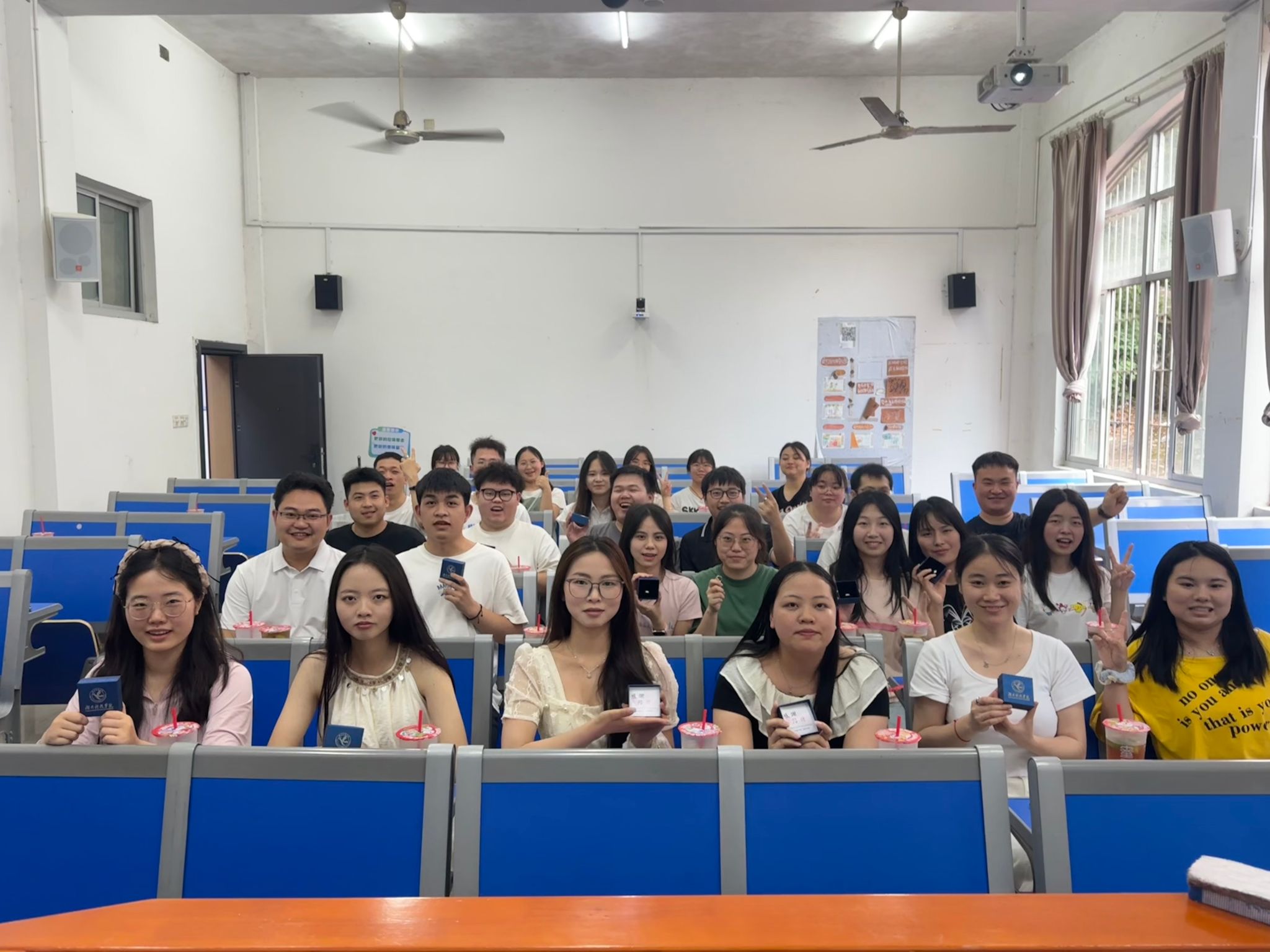 主会场议程结束后,各班级回到原自习室开展最后一次主题班会。班主任为每位毕业生佩戴定制纪念戒指——外圈镌刻“bat365中文官方网站”校名及校徽,内壁铭刻学生班级与姓名的专属印记。在书写“我的大学回忆”明信片环节,泛着奶茶香气的教室中,学生们将四年时光凝练成300字的青春诗行。正值“520”特别日子,各班为每位同学准备了玫瑰、奶茶和零食礼包,辅导员龙枚樱说:“玫瑰寓意绽放的青春,奶茶象征生活的甘甜,零食则是学院永远温暖的守候。”