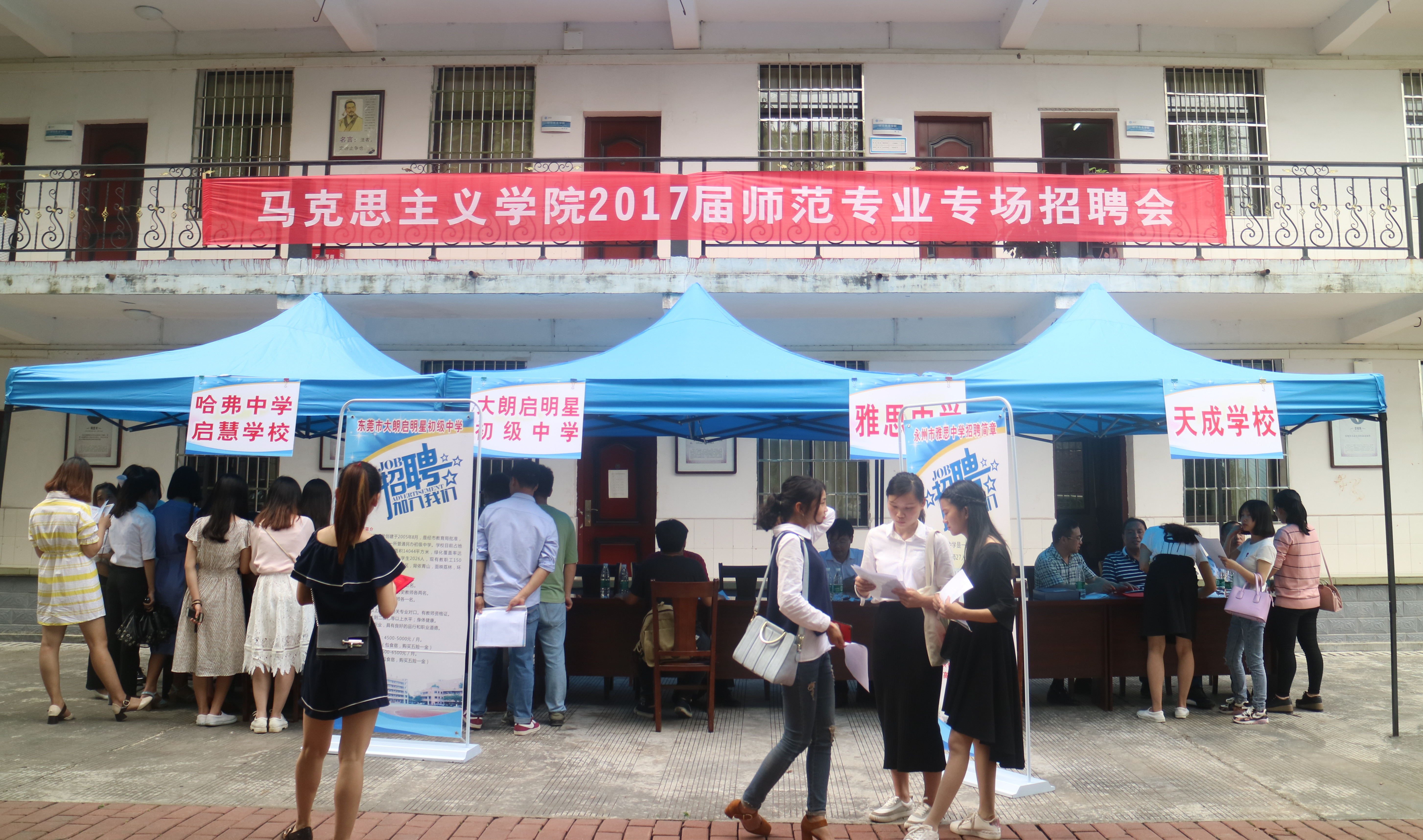 本网讯(通讯员 贺茶湘) 5月16日下午,马克思主义学院举行2017届师范类专场招聘会,经过筛选本次招聘会共邀请5家用人单位参会,提供各科教师岗位95个,吸引了来自不同院系的上百名毕业生前来应聘。