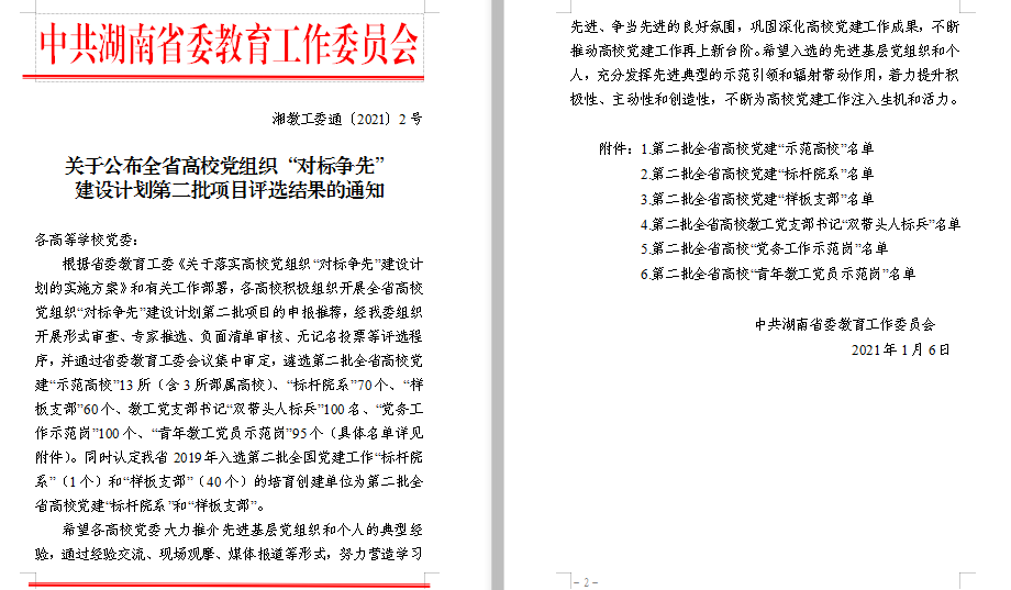 本网讯 2021年1月6日,湖南省教育工委公布了全省高校党组织“对标争先”建设计划第二批项目评选结果,我院教工第二党支部荣获全省高校党建“样板支部”,我院党总支书记郑向晖荣获全省高校“党务工作示范岗”,这是学院党建工作继2019年4月荣获“全省高校党建工作标杆院系”称号后再获殊荣。
