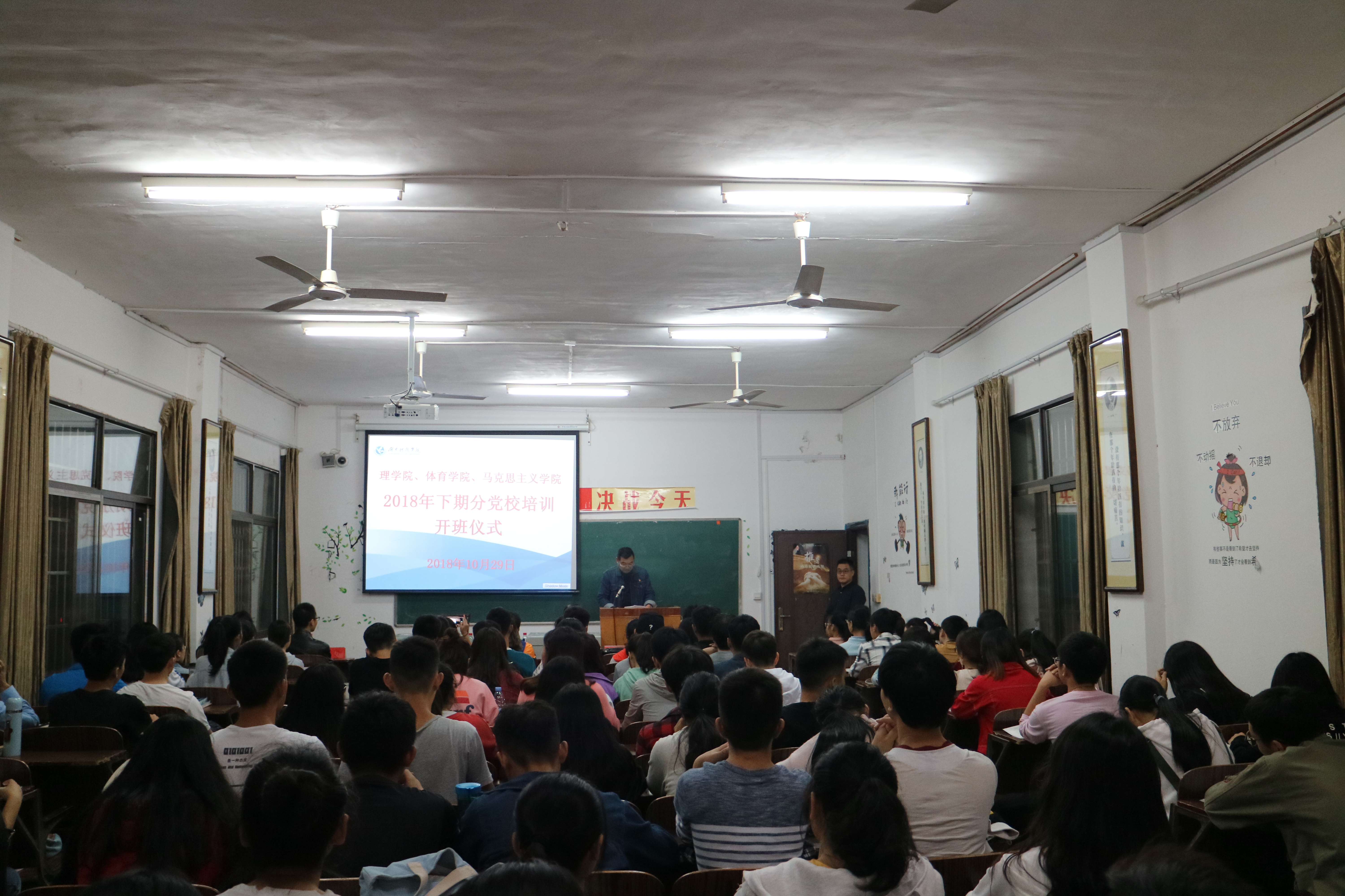 本网讯(通讯员尹玉婷黎雪平)10月29日晚,由马克思主义学院、理学院、体育学院联合举办的2018年下期分党校培训班开班典礼在鹤鸣楼501教室举行。三个学院共94名学员参加本次分党校培训。