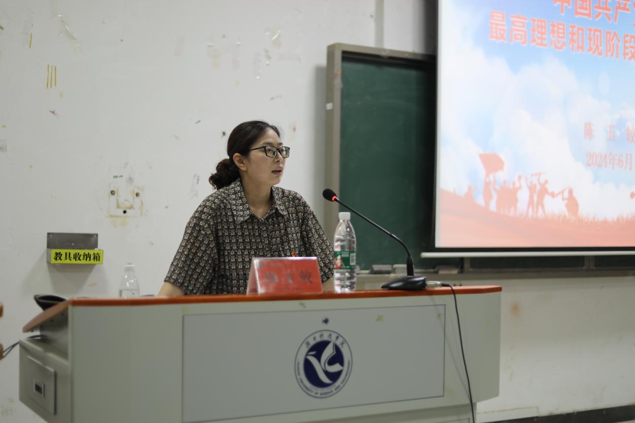 本网讯(记者 杨鑫杰 郭瑞)为进一步加强对入党积极分子的培养教育,提高其政治觉悟和理论素养,6月11日,由我院、智能制造学院、经济与管理学院共同组成的分党校入党积极分子培训开班仪式暨第一堂课,于立信楼602教室顺利开展。马克思主义学院党总支书记陈玉皎给全体学员讲授第一堂课。