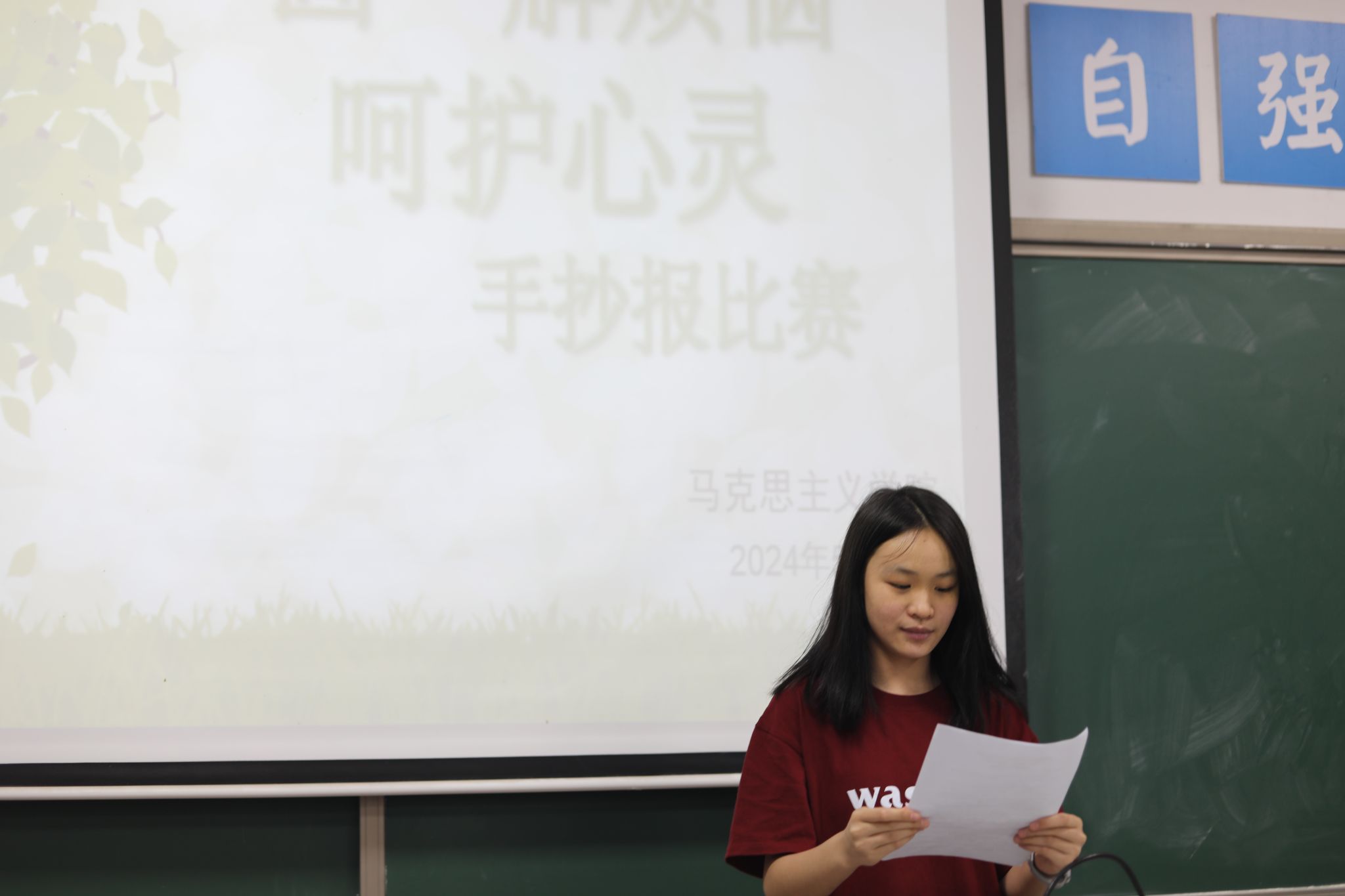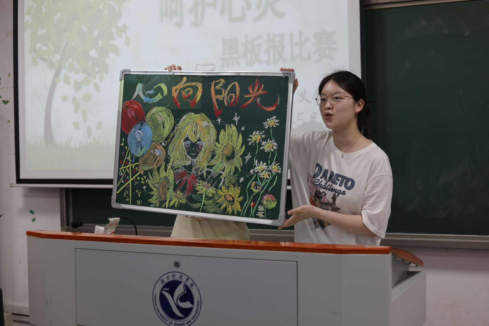 活动伊始,主持人为同学们讲解心理健康的重要性并分享一系列实用的日常心理健康维护方法。紧接着,各参赛队伍的代表们纷纷登台,以图文并茂的黑板报形式,展现独特的创作理念和心理健康见解。