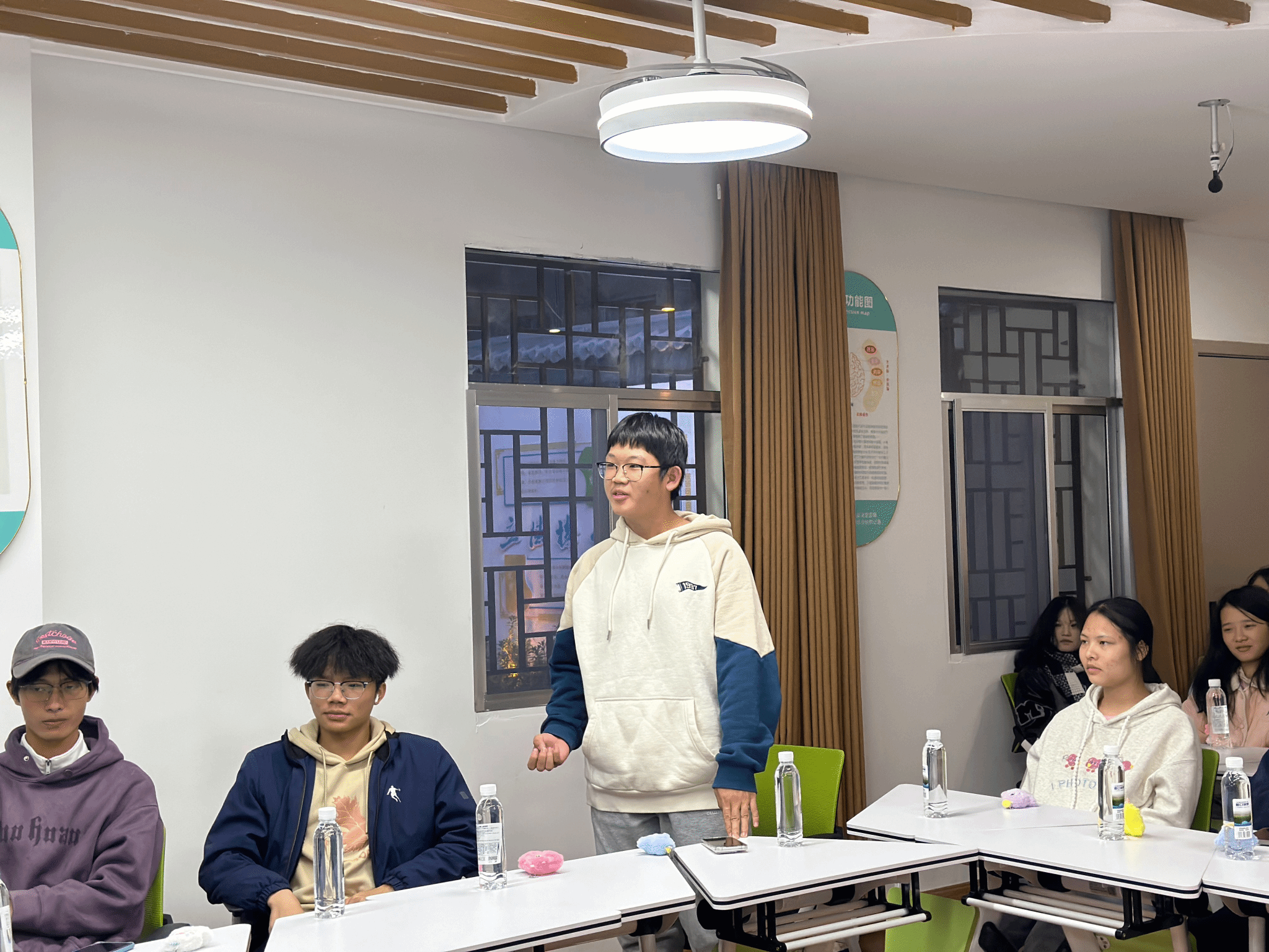 分享讨论交流环节,参会同学积极诉说困难与贡献缓解小妙招,通过对话疗愈的方式,引导同学们认清自我、接纳自我、缓解自我,增强心理韧性,抢答环节更是将气氛推向高潮。最后,特邀老师赵江南、曹惠如从教育心理学、管理学角度就同学们提出的困惑给出建议,为同学们拨开迷雾。