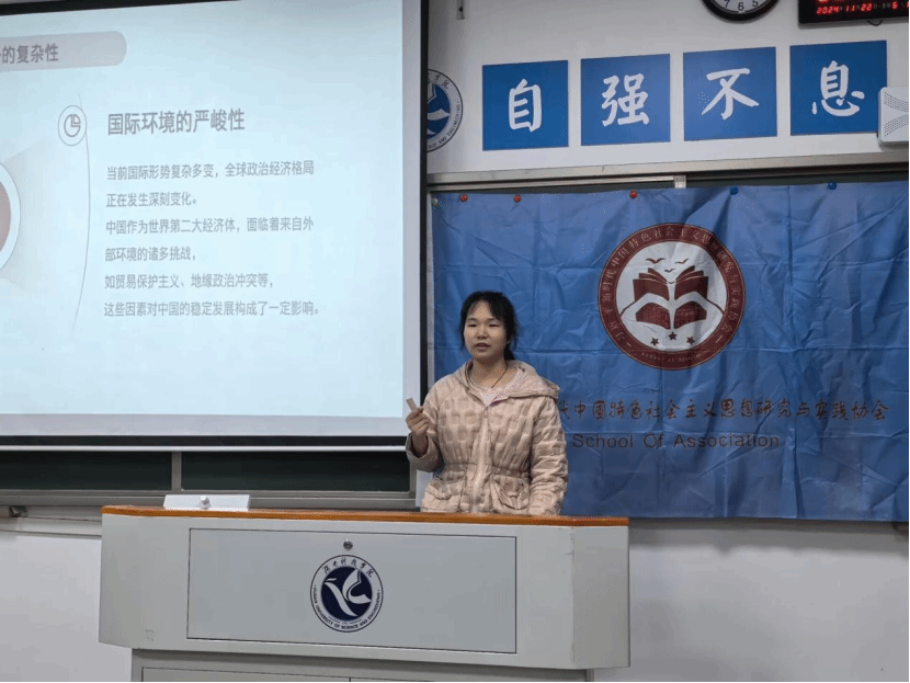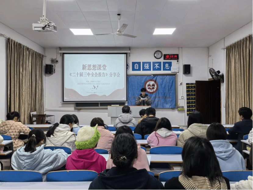 活动中,邓昱全老师为会员们讲述二十届三中全会的背景,思政2201班黄俊松关于“马克思主义经典作家关于消灭城乡差别思想对我国完善城乡融合发展体制机制的启示”谈论遵循城乡发展规律,推进城乡融合发展的方向;思政2301班陈岳景针对逆全球化的现象分享道:“逆全球化背景下,我国以党的二十届三中全会精神为指引,构建新发展格局,展现担当,为经济发展与世界稳定贡献力量。”