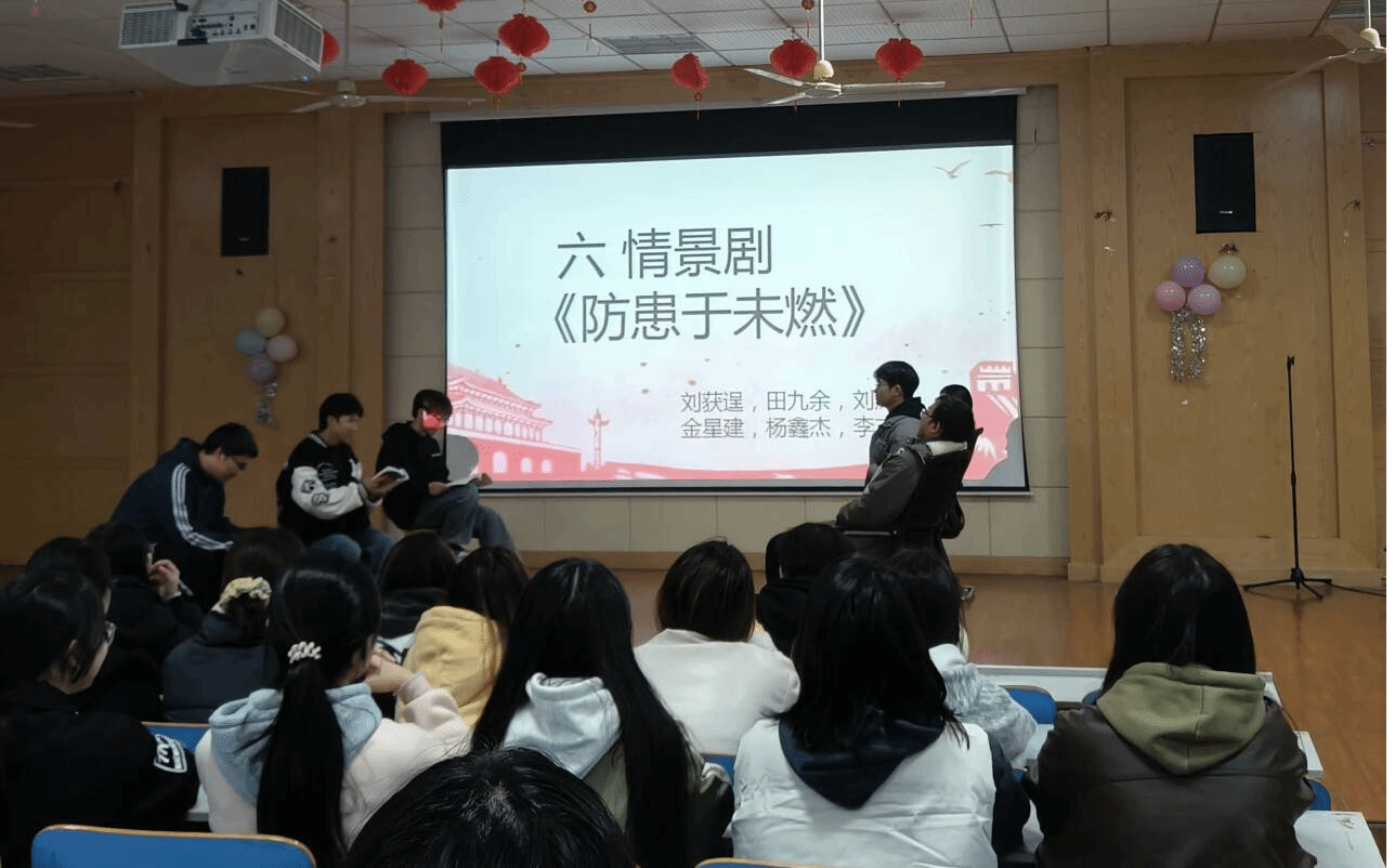 团日活动形式丰富,包括观看教育视频、朗诵、合唱、原创情景剧、主题团课等。通过观看团日视频,同学们学习了火灾成因、预防措施、逃生策略以及消防工具使用等知识;朗诵《中国消防》深情礼赞消防员的伟大与奉献;合唱《送你一朵小红花》传递出对消防员的敬意与感激;原创情景剧《防患于未燃》科普了宿舍消防安全紧急应对小技巧与干粉灭火器的使用方法,让同学们在欢笑中深刻认识到宿舍消防的重要性;团课《消防安全,你我共建》围绕火灾的类型、逃生的方法、消防器的使用等方面展开,为我们敲响了消防安全的警钟。
