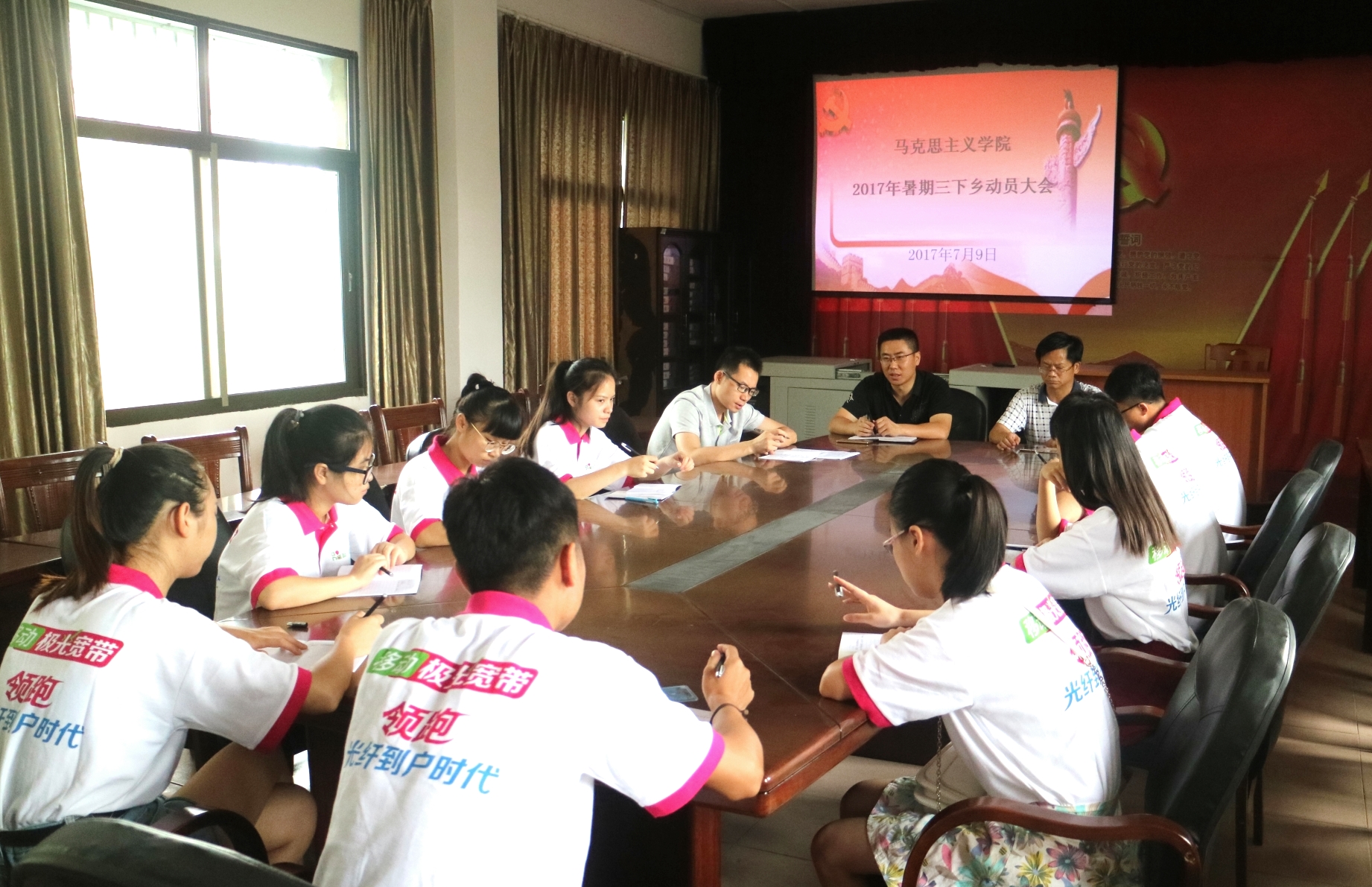本网讯(记者 贺茶湘)为更好开展2017年暑期三下乡活动,马克思主义学院于7月9日下午在鹤鸣楼405会议室举行动员大会。会议由学工办主任兼辅导员全伟老师主持,党总支副书记李观求和李钟麟教授参加。