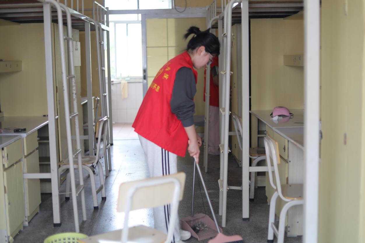 活动当天,志愿者们准时集合。负责人强调安全事项与清扫标准,要求地面无杂物、门窗无污渍、墙面无蜘蛛网,公共区域保持整洁。随后,志愿者们携带扫把、抹布等工具有序进入宿舍,开展全方位清洁工作。