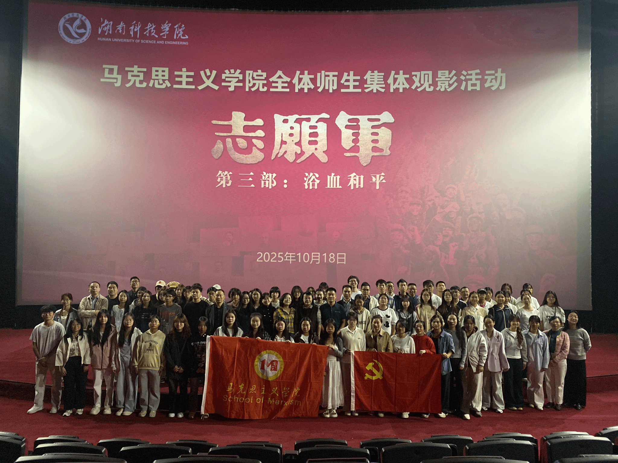 本网讯(记者 易倩文)为深化爱国主义教育,厚植师生家国情怀,10月18日晚,马克思主义学院组织师生集中观看影片《志愿军:浴血和平》,以沉浸式体验开展了一堂生动深刻的思政公开课。