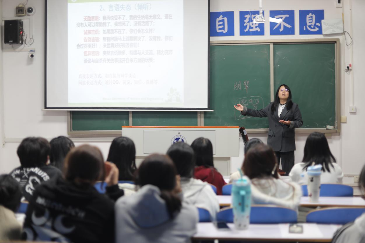培训中,曹惠如从“心理危机概述、信号识别、科学干预、提前预防”四个方面展开系统讲解,她强调心理信息员要具备敏锐的观察力,及时掌握班级同学的心理动态;她还重点介绍了倾听与共情等基本沟通技巧,鼓励大家在尊重与保密的前提下,为有需要的同学提供帮助;此外,在考试、放假等重要时间节点,应密切关注同学们身心状态,助力维护校园和谐稳定。