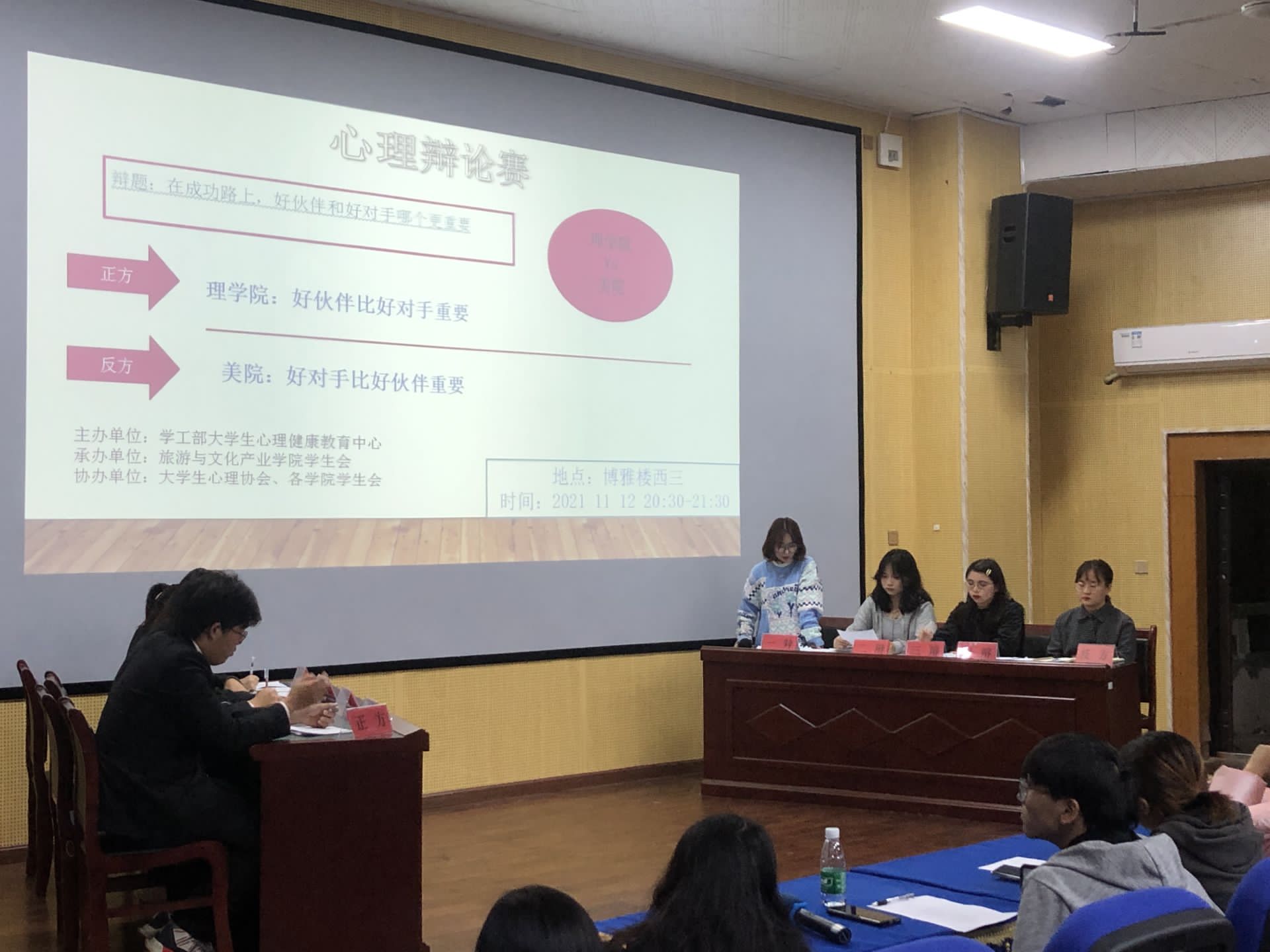 本网讯(通讯员周怡君)2021年11月12日晚,bat365中文官方网站于博雅楼开展了八强进四强的辩论赛。本次辩论赛,主办单位为学工部大学生心理健康教育中心,承办单位为旅游与文化产业学院学生会,协办单位为大学生心理协会及各学院学生会。本次辩论赛的辩题为“在成功路上,好伙伴和好对手哪个更重要”,正方为持“好伙伴比好对手重要”观点的理学院与持“好对手比好伙伴重要”观点的美院。