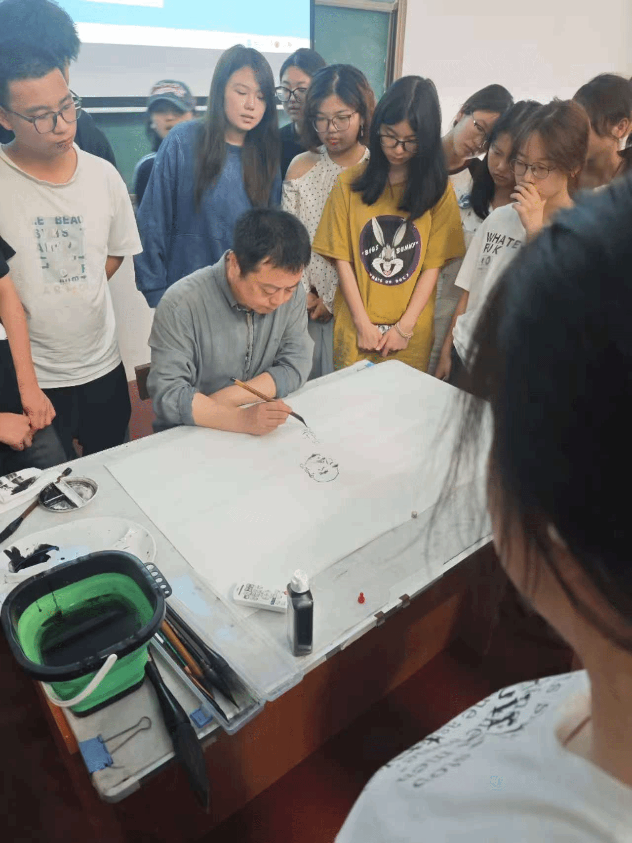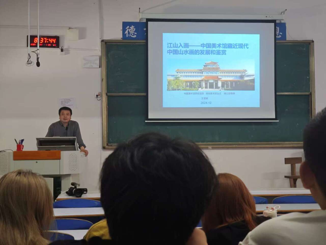 王雪峰博士以《中国美术馆藏20世纪山水画精品展》为题,以中国美术馆藏20世纪山水画为线索,分别讲解了“为什么需要艺术”、“传统:农耕时代的四大艺术系统”、“现代:中西碰撞与社会变革下的中国绘画”等三部分内容。讲座之后又进行了现场示范作画。两个环节都精彩纷呈,案例丰富,讲解生动,视野开阔,赢得在座师生的热烈掌声,大家纷纷感叹受益匪浅。