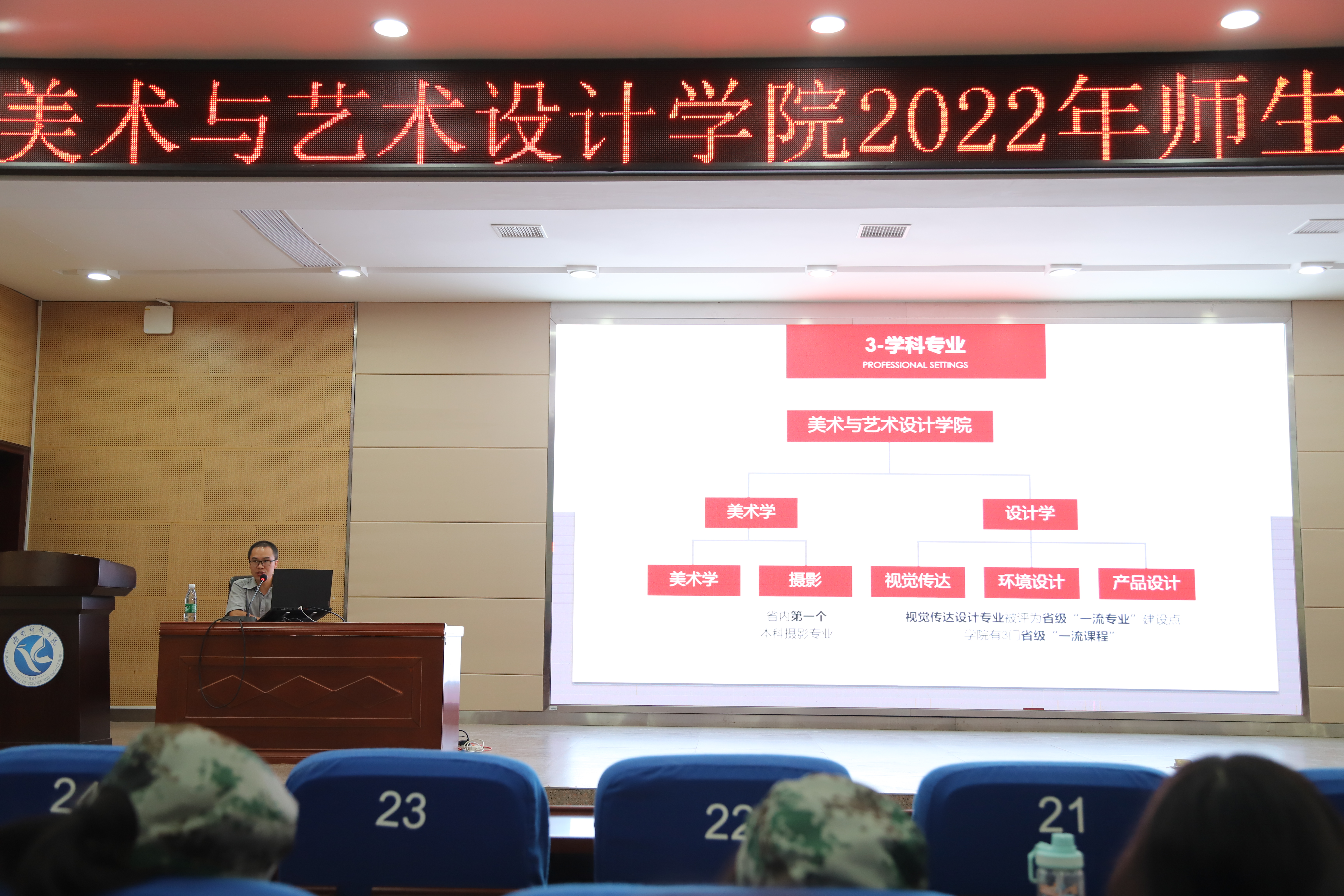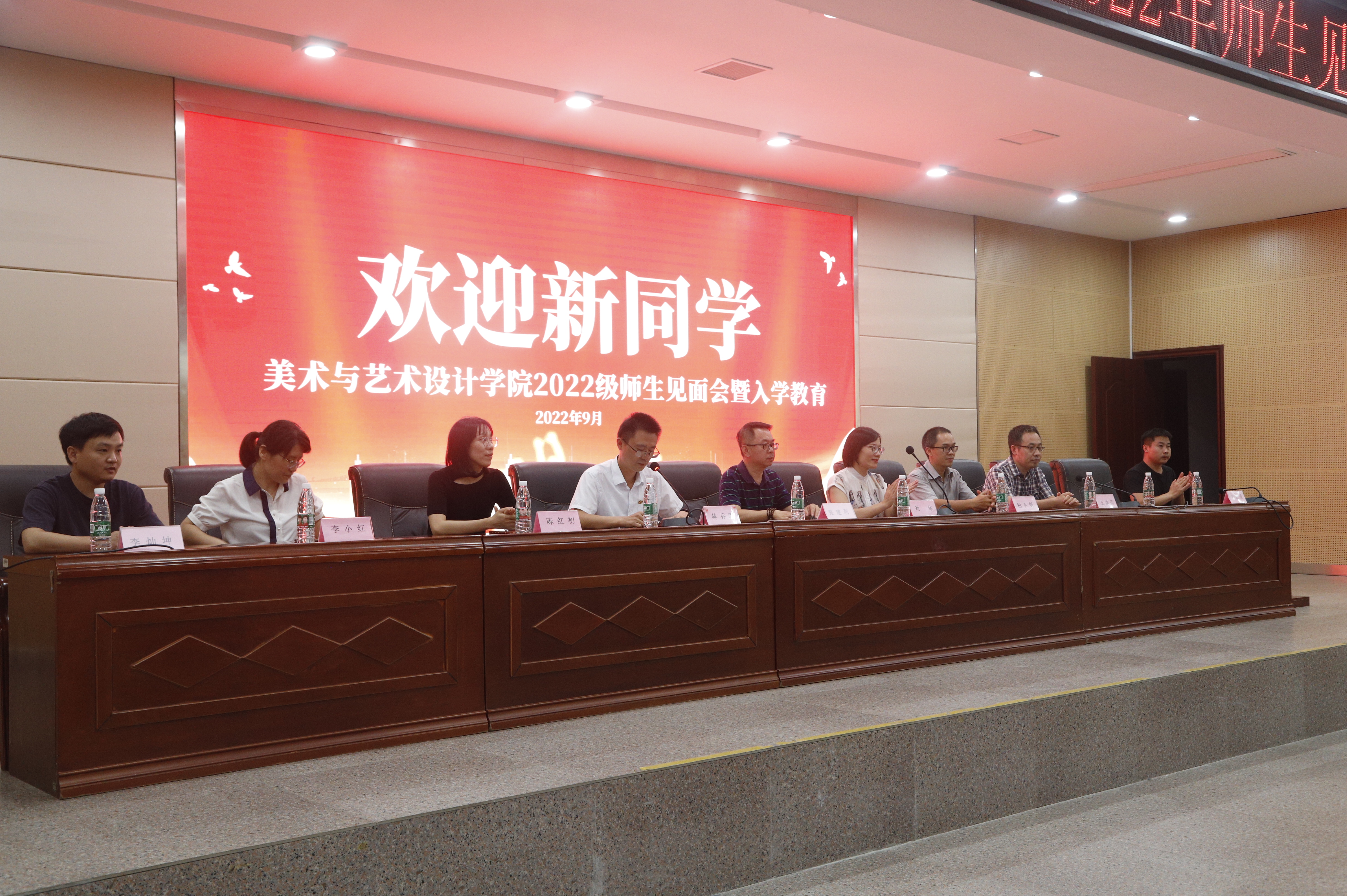 本网讯(通讯员:卿可青)9月23日晚上19点,bat365中文官方网站美术与艺术设计学院在潇湘大讲堂举行2022级师生见面会暨入学教育。出席本次见面会的有院长张建利、副院长刘华、副院长柏小剑、各系系主任、各年级辅导员、2022级全体班主任。参加本次见面会的有2022级全体学生和美院团委学生会成员,本次会议由副书记林乔军主持。