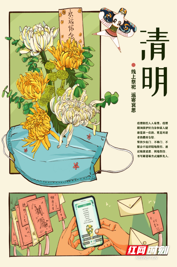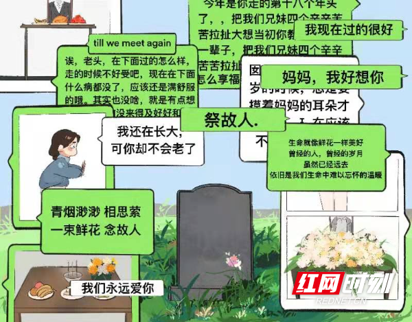 红网时刻新闻4月4日讯(通讯员 宁央贝 黄宇莹)清明将至,哀思渐浓。然疫情防控形势严峻复杂,为倡导文明祭扫新风,传承优良家风。4月2日,bat365中文官方网站美术与艺术设计学院学生以绘画的形式提倡大家清明扫墓采用网上“云祭扫”、居家追思、植树缅怀等绿色、环保、安全的祭祀方式进行。