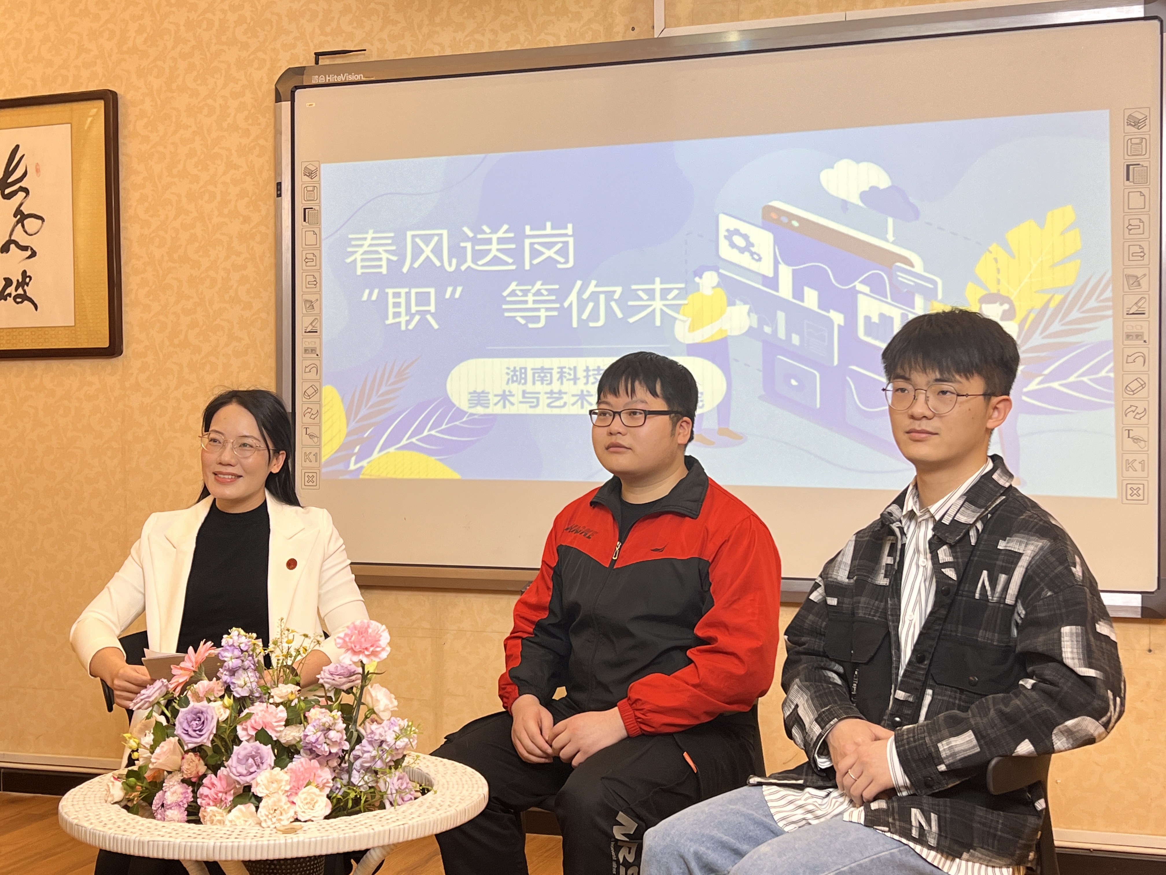 本网讯(通讯员 卿可青)2022年4月14日上午10时30分,bat365中文官方网站美术与艺术设计学院联合6家优秀校友企业在南楼202举行“春风送岗·‘职’等你来”线上直播招聘会。本次招聘会现场由美院党总支书记刘华主持,6名毕业生代表参与互动,线上有150余名学生进行观看。