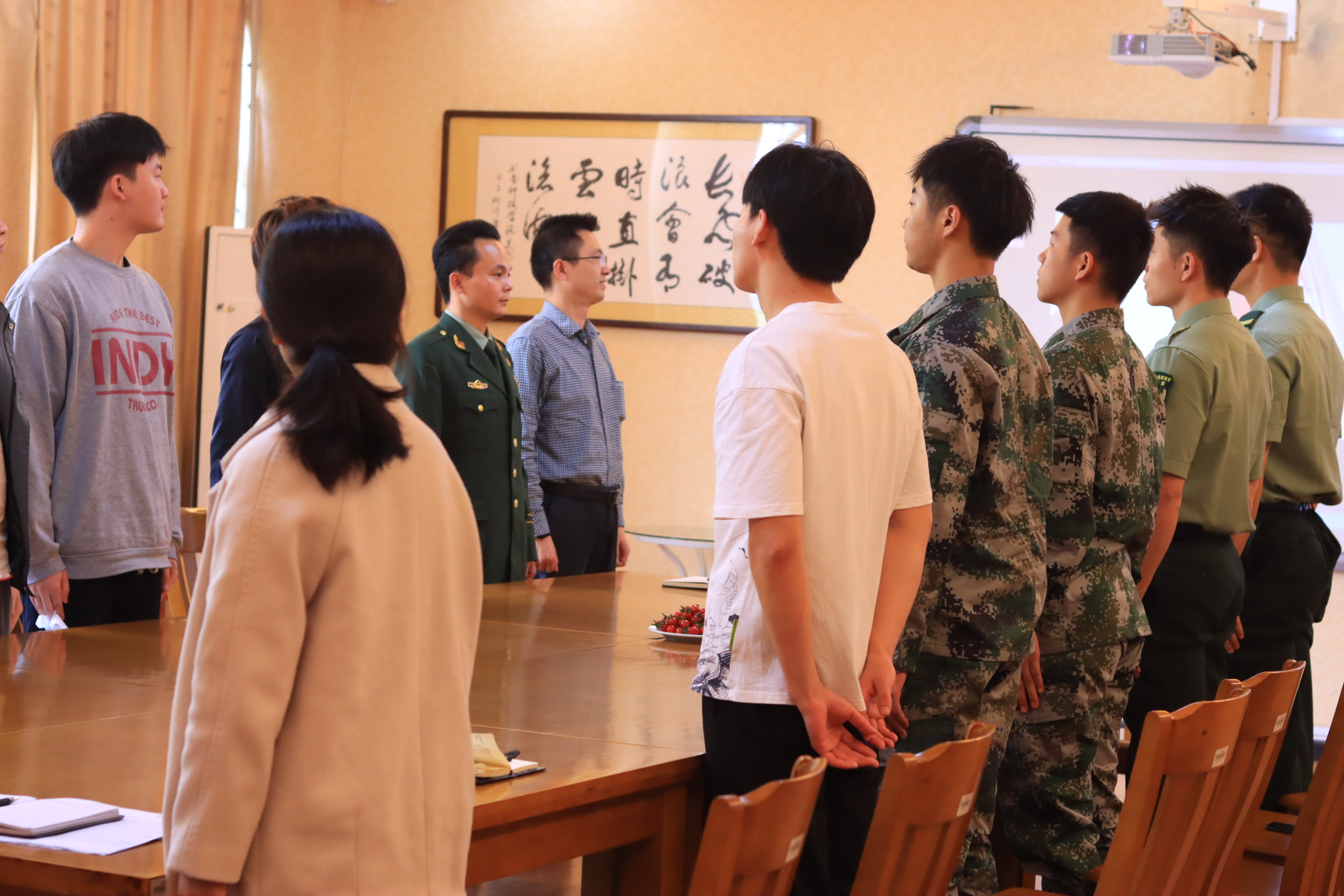 最后,全体参会成员唱响国歌,座谈会圆满结束。刘华书记表示这是一群最可爱的人,学院会更加广泛收集意见和建议,为有意愿入伍的同学提供更好的平台,也为退伍复学的同学提供支持,为他们成长成才营造良好氛围,进一步做好退伍军人优抚保障工作。