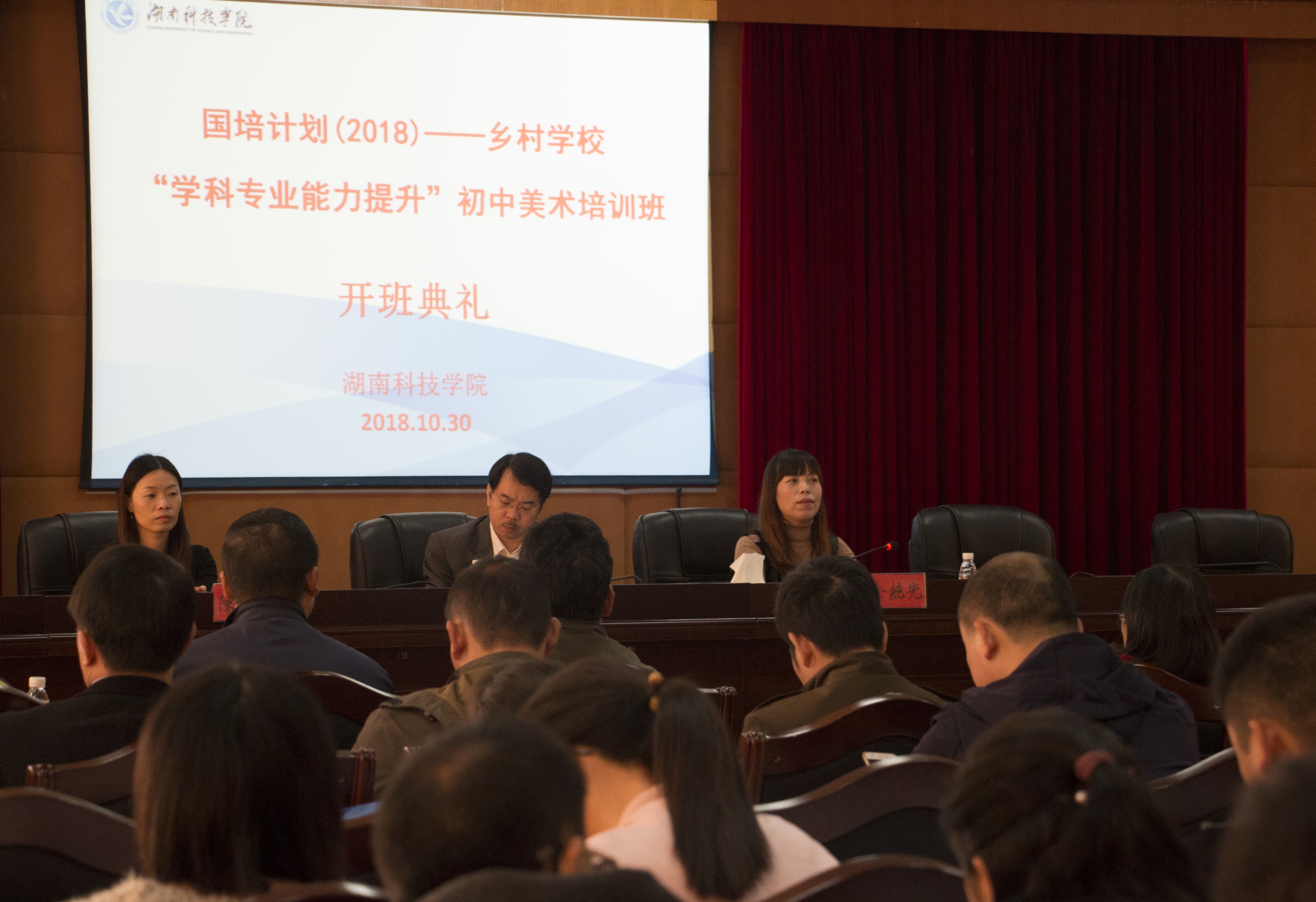 本网讯 10月30日上午,“国培计划(2018)”——乡村学校紧缺薄弱学科专业不对口兼职教师“学科专业能力提升”培训班在行政楼一会议室顺利开班。继续教育学院院长徐纯先教授、美术与艺术设计学院院长张建利教授及来自全省70名培训学员参加开班仪式。张建利教授主持开班仪式。