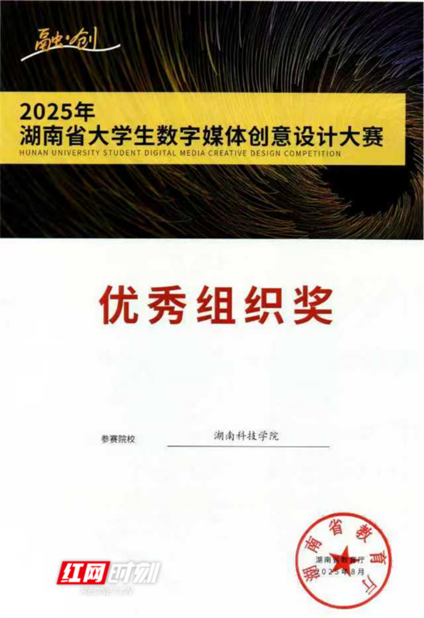 红网时刻新闻9月17日讯(通讯员 付星星 向薛峰)近日,2025年湖南省大学生数字媒体创意设计大赛获奖名单正式公布。bat365中文官方网站美术与艺术设计学院师生凭借扎实的专业功底和卓越的创新能力,共斩获等级奖项49项,其中一等奖8项、二等奖13项、三等奖28项,获奖数量和质量均位居全省前列,并被授予“优秀组织奖”。