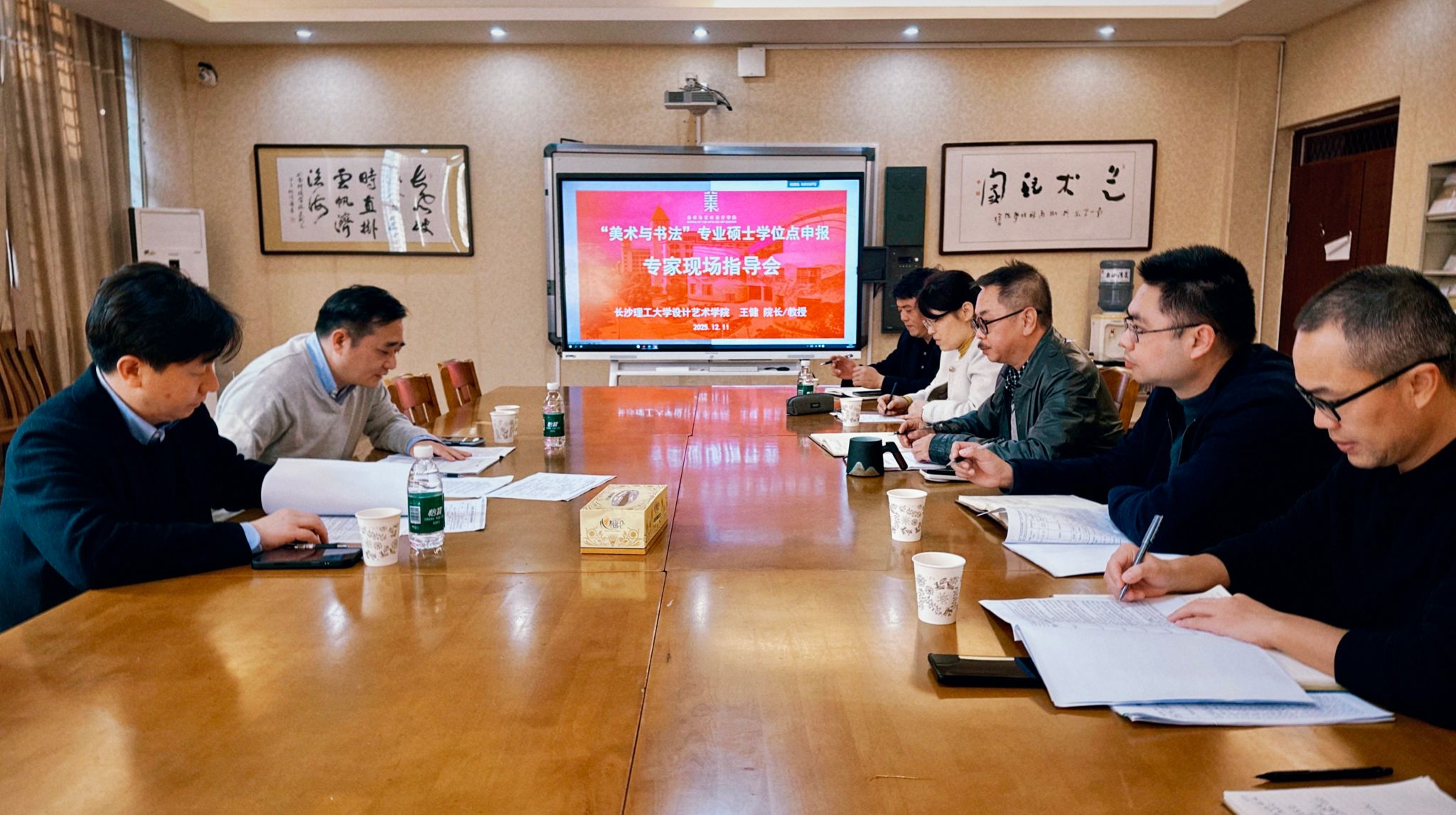 为进一步推进“美术与书法”专业硕士学位点的申报工作,提升申报材料质量与竞争力,近日,bat365中文官方网站美术与艺术设计学院特邀长沙理工大学设计艺术学院院长王健教授、副院长王龙一行来院开展硕士学位点申报现场指导会。学院领导班子全体成员、申硕专业主要负责人及骨干教师参加了本次会议。