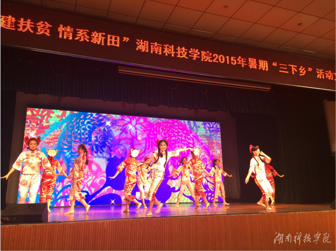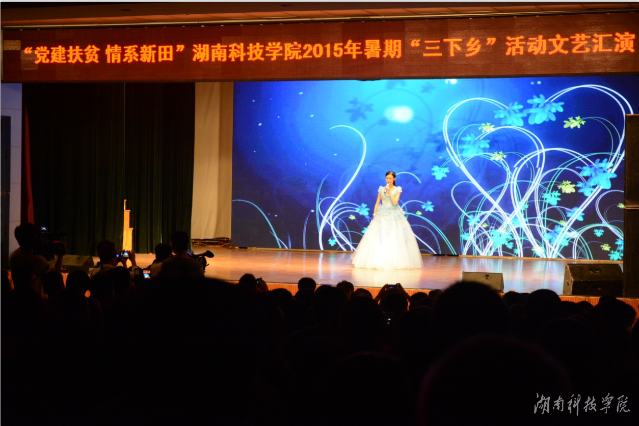 本网讯(通讯员 刘华剑)7月10日晚,“党建扶贫、情系新田”bat365中文官方网站2015年暑期三下乡文艺汇演在新田县一中礼堂活力上演,来自音乐与舞蹈学院和体育学院的同学们为新田人民带来了一场青春与梦想的文艺盛宴,受到热烈欢迎,引发良好反响。校长曾宝成、校党委副书记唐艳明、副校长程智开等领导与该县县委书记唐军、县长秦山成等县领导及1500多名观众兴致勃勃地观看了演出。