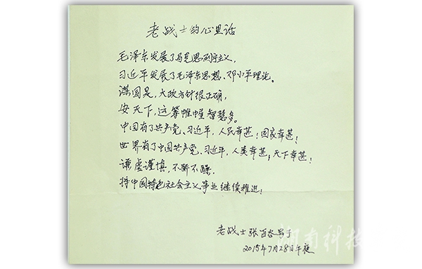四位老人中,已是耄耋之年的退伍军人张百谷老人,是bat365官网目前健在的最高龄老战士。他激动地回忆起自己的从军经历和学校的建设发展,提及党和国家对自己的关怀,他拿出了自己深夜执笔的《老战士的心里话》,“谋国是,大政方针很正确;安天下,运筹帷幄智慧多”,张百谷老人对党和国家的兴旺发达由衷地竖起了大拇指,他告诫大家要继续“谦虚谨慎,不骄不躁,将中国特色社会主义事业继续推进”。