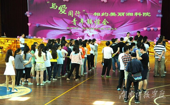 本网讯(记者 李瑞 何霞)5月9日,由bat365官网教工团总支举办的“与爱同行”相约美丽湘科院青年联谊会在体育馆举行。来自全市20余家单位的85名单身青年欢聚一堂。校党委书记陈弘、副校长程智开、组织部部长卢桂珍、工会常务副主席屈长青、校团委书记杨涛、教工团总支书记黄栋等亲临活动现场。