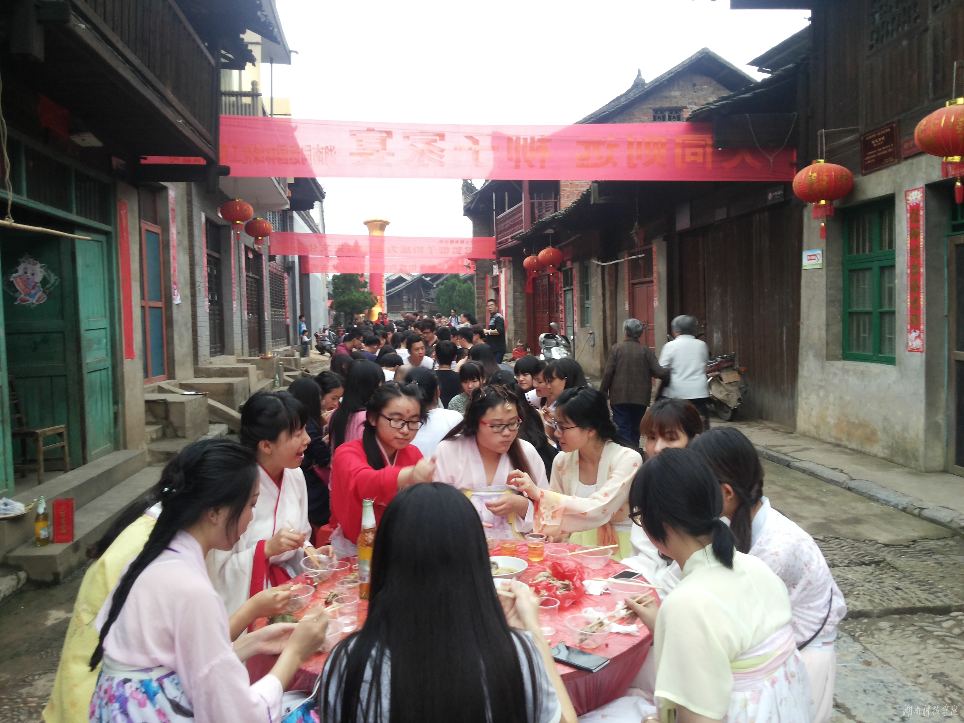 bat365官网汉服社带来舞蹈《礼仪之邦》助兴开幕表演,以汉舞演绎和诠释汉文化的内涵,让大家感受到传统文化的魅力,赢得了阵阵掌声。近半个小时的文艺演出结束后,百家宴正式开席。只见柳子古街上,一张张铺红色桌布的圆桌沿青石板街道一字排开,桌上摆满各色美味菜肴。大家品菜肴,话家常,处处洋溢着浓浓的喜庆、和谐氛围。
