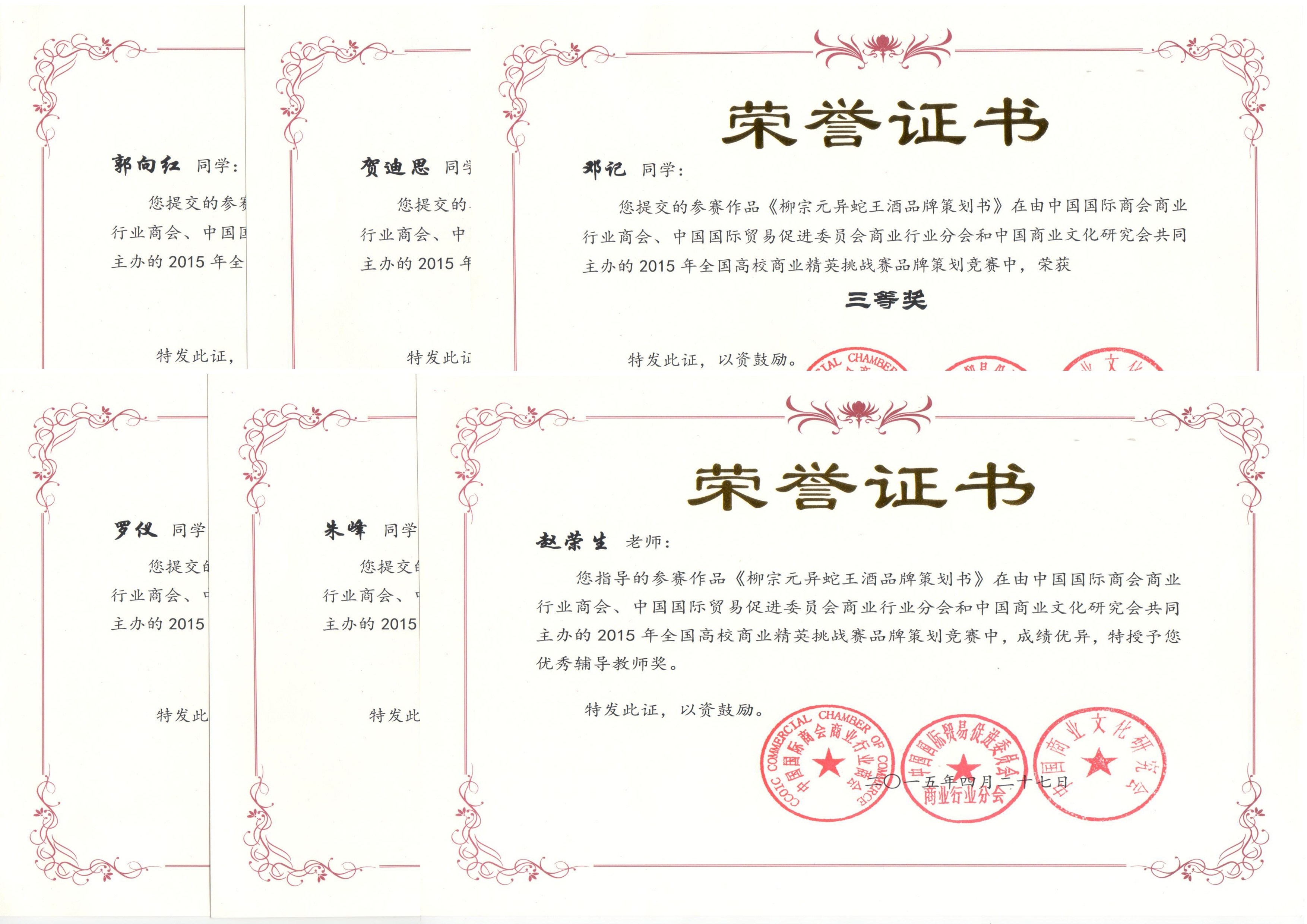 本网讯(就业创业指导中心)近日,2015年全国高校商业精英挑战赛在北京举行。bat365官网由郭向红、贺迪思、邓记、罗仪、朱峰组成的大学生创新创业团队“‘早柒点’创意策划工作室”报送的《柳宗元异蛇王酒品牌策划书》获三等奖,赵荣生获优秀辅导教师奖,永州异蛇科技实业有限公司获最佳校企合作奖。