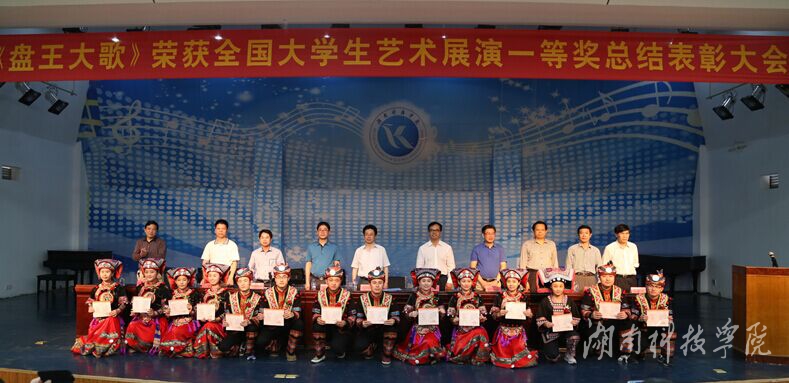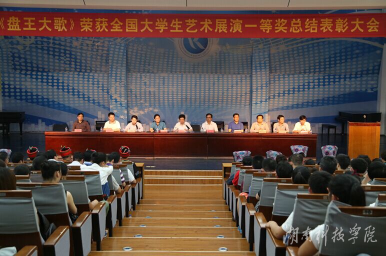 本网讯(记者 李瑛 牛泽宇 摄影 秦峰 周晓辉)5月7日下午,学校在音乐楼小演播厅召开大会对《盘王大歌》荣获全国大学生艺术展演一等奖进行表彰。校党委书记陈弘、校长曾宝成、副校长宋宏福、纪委书记彭立威,副校长郑山明、吴小林、程智开,正校级督导袁先友,工会主席、副校级督导陈仲庚等在家校领导出席,并为获奖师生颁奖。表彰会由副校长李常健主持。