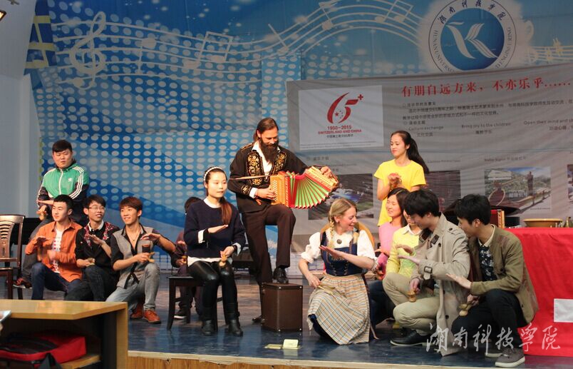 瑞士艺术家们向大家介绍了瑞士地理位置、风土人情和传统音乐舞蹈,展示了瑞士传统民间乐器“山迪”、“手风琴”以及用生活用具做成的乐器等。随后,艺术家们演唱了瑞士民歌,表演了传统舞蹈,具有浓郁异域风情的节奏和热情灵动的舞蹈,让大家仿佛置身于“欧洲屋脊”。艺术家们还现场与学生进行互动,教学生唱瑞士民歌、跳传统舞蹈、演奏民间乐器,热情友好的气氛深深感染了在座的每位师生。音乐无国界,bat365官网师生通过演奏中国传统乐器古筝、二胡等方式进行了互动交流,将中国古典音乐的优美动听表现的淋淋尽致,向瑞士友人展示了中国古典音乐的魅力。