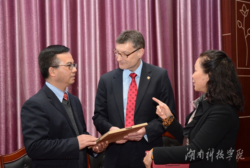 校党委书记陈弘、校长曾宝成、副校长宋宏福等领导热情接待了代表团一行。曾宝成对代表团的到来表示热烈欢迎,介绍了学校办学情况,希望两校加强交流,实现优势互补,建立全面、长期的战略合作关系,共同提高办学水平。曾宝成说:“两校在生机勃勃的春天播下教育合作的种子,只要用心给这颗种子浇水、施肥,这颗种子一定会发芽、生长,开出灿烂的交流之花,收获丰硕的合作之果”。该校校长鲍尔温高度赞同曾宝成校长的意见。他表示,期待两校通过进一步的合作交流,促进共同发展。