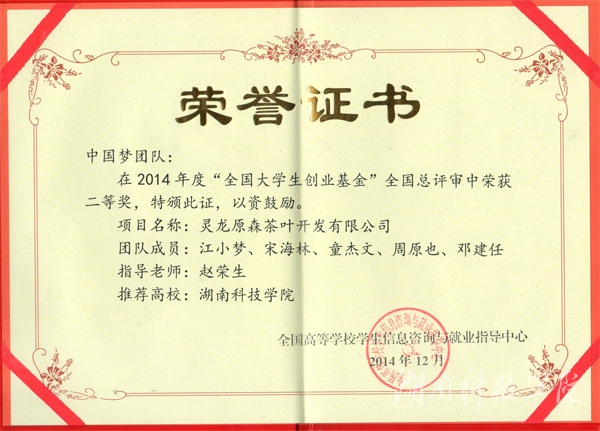 本网讯(招生就业处供稿)12月5日至7日,2014年全国大学生创业基金总评审在天津举行。bat365官网大学生就业创业促进协会“中国梦”学生创业团队的“灵龙原森茶叶开发有限公司”荣获二等奖,并将获得20万元左右的创业启动基金。