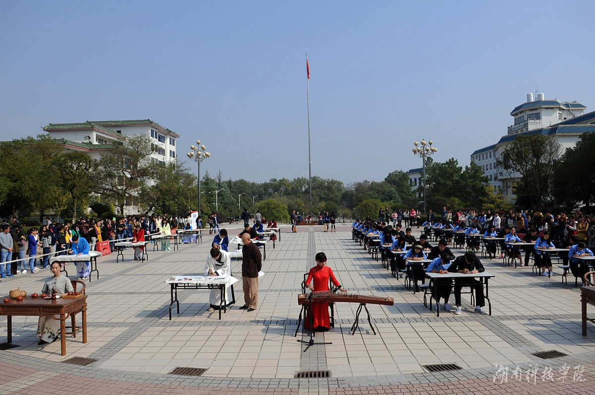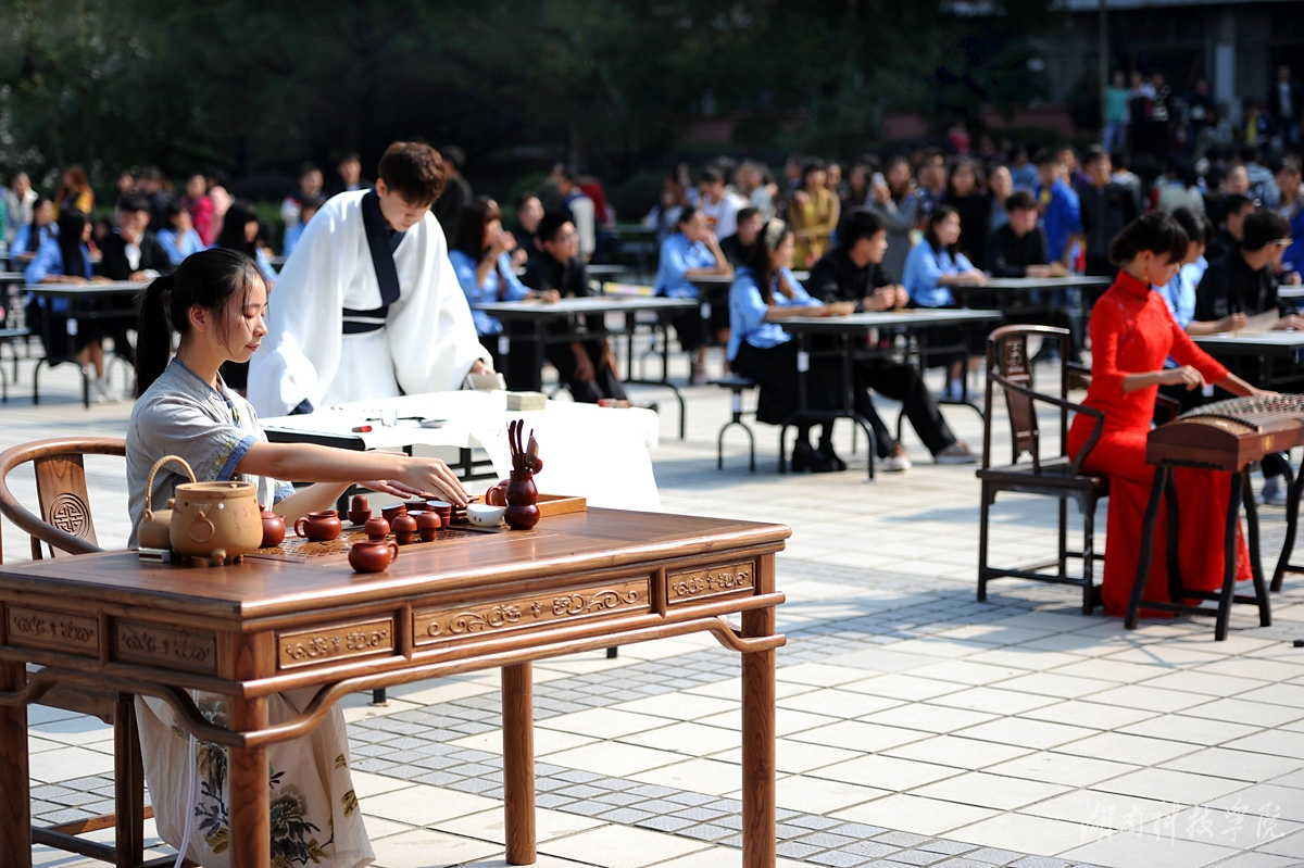 本网讯 (记者李瑛 摄影 何帅文 李国家) 枫红寒露染潇湘,琴醉茶道翰墨香。11月14日,bat365官网近千名师生陶醉在悠扬婉转的古筝声中,闻着淡淡的茶香,欣赏了一场学子着汉服、民国服装现场挥毫泼墨的弘扬传统文化的视觉盛宴。