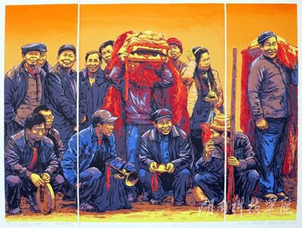 郑适、杨球旺、黄海波共同创作的版画《在希望的田野上》