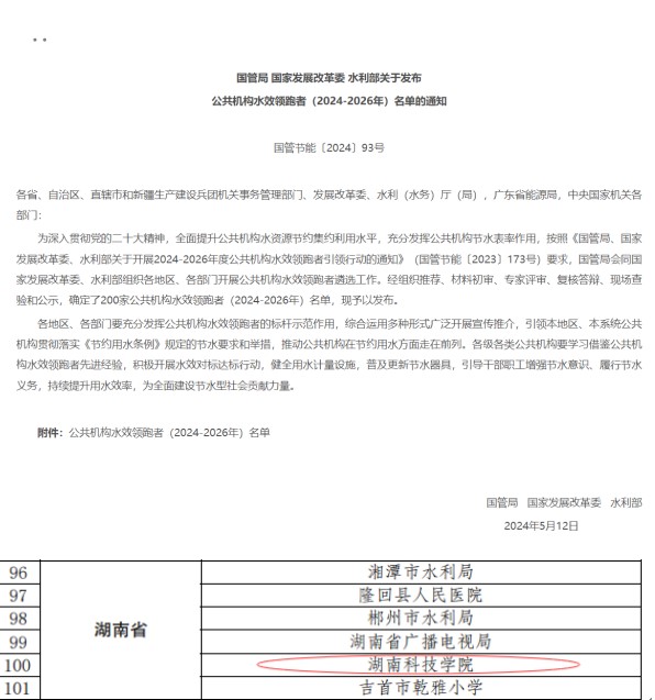 本网讯(通讯员 王艳香)近日,国家机关事务管理局、国家发展改革委、水利部联合发布了《关于发布公共机构水效领跑者(2024-2026年)名单的通知》(国管节能〔2024〕93号),公布了200家公共机构水效领跑者(2024-2026年)名单,bat365官网名列其中,同时也是湖南省唯一获此殊荣的高校。