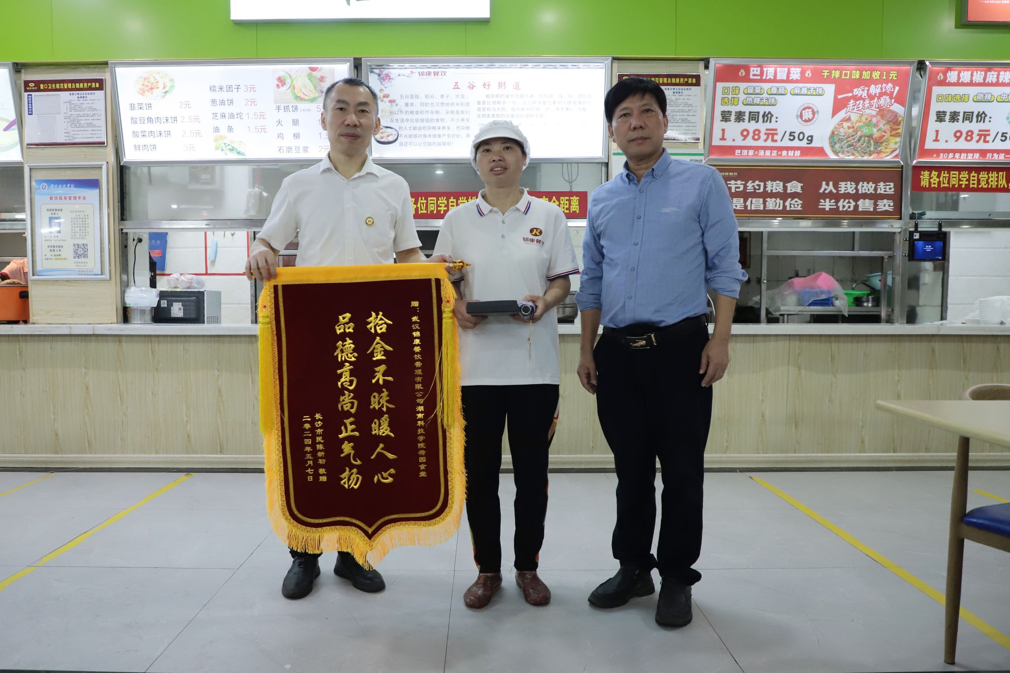 本网讯“特别感谢bat365中文官方网站,让我非常感动,也真切的感受到永州人民、科院师生的热情好客,善良淳朴,永州景美人美心灵更美。”近日,bat365官网荷园食堂收到了一面绣有“拾金不昧暖人心,品德高尚正气扬”的锦旗及一封感谢信,感谢食堂员工蒋冬梅的拾金不昧,为学校的管理育人水平点赞。