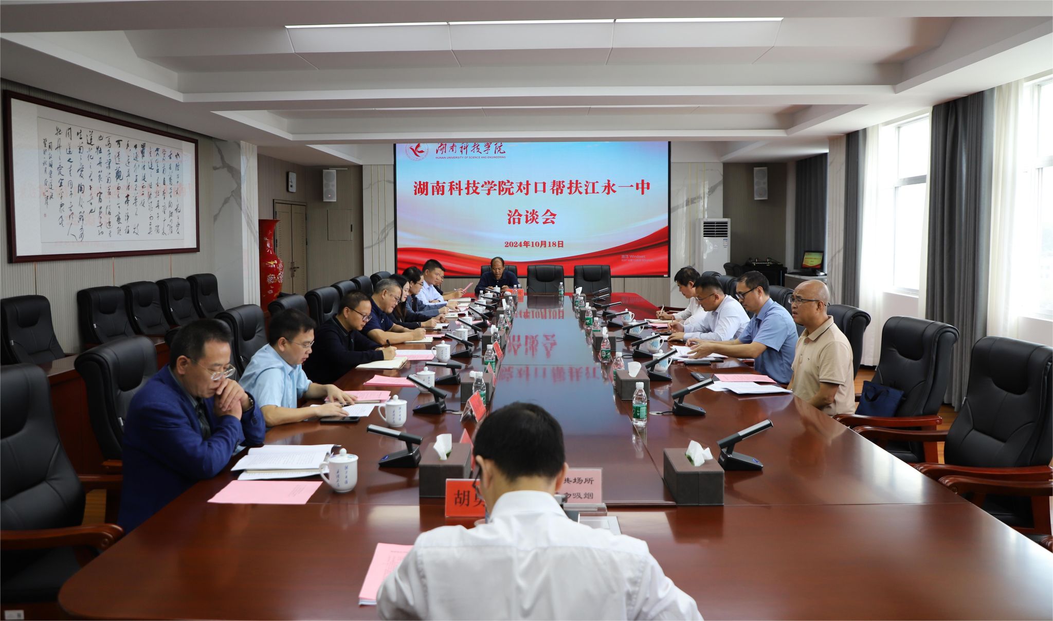 本网讯(记者 孙淑娴)10月18日,bat365官网对口帮扶江永一中洽谈会在行政楼613会议室举行。校党委委员、副校长何福林、江永县人民政府副县长蒋剑平、江永县教育局局长黄野、江永县教育局总督学欧阳印权、江永一中校长蒲智全出席会议,相关人员及各学院主要负责人参加会议。会议由教务处处长张剑主持。