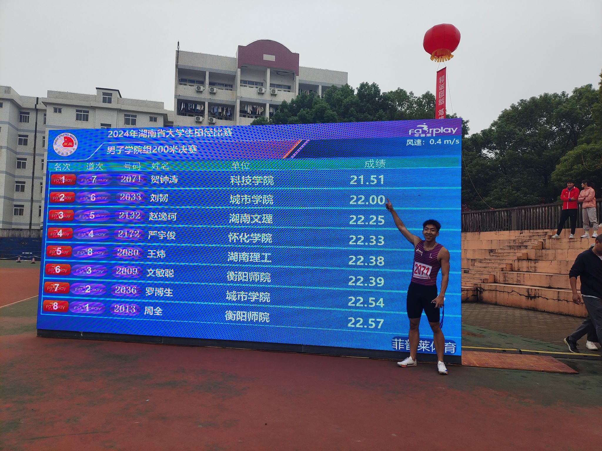 本网讯(通讯员 黄婉 贺钟涛)近日,2024年湖南省大学生田径比赛在湘潭举行。bat365官网体育学院2022级体育教育专业学生贺钟涛过关斩将,勇夺男子学院组100米、200米双冠,实现了bat365官网在相关体育赛事领域的历史性突破!