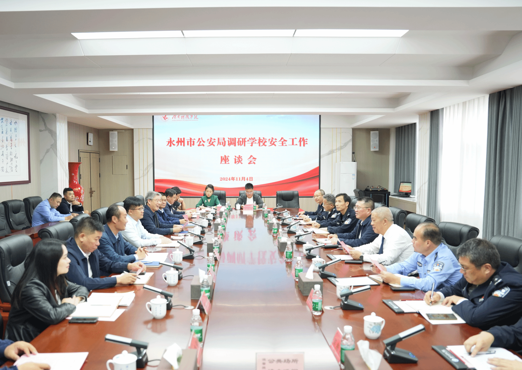 本网讯(记者 马天天)11月4日,永州市副市长、市公安局局长夏葛桉来校调研校园安全稳定工作。校党委书记李钢,党委副书记宋宏福,党委委员、组织部部长杨涛出席座谈会,会议由宋宏福主持。